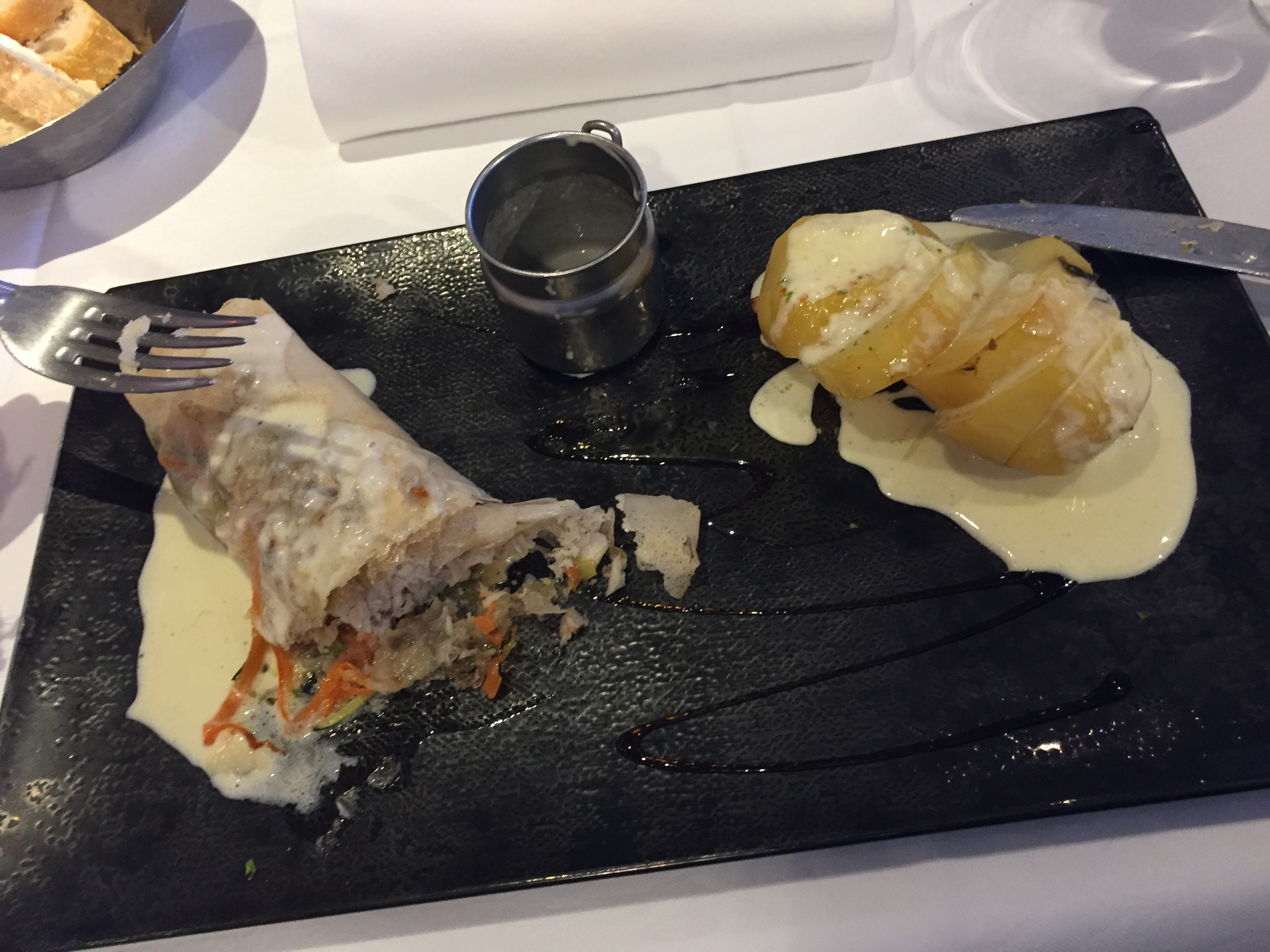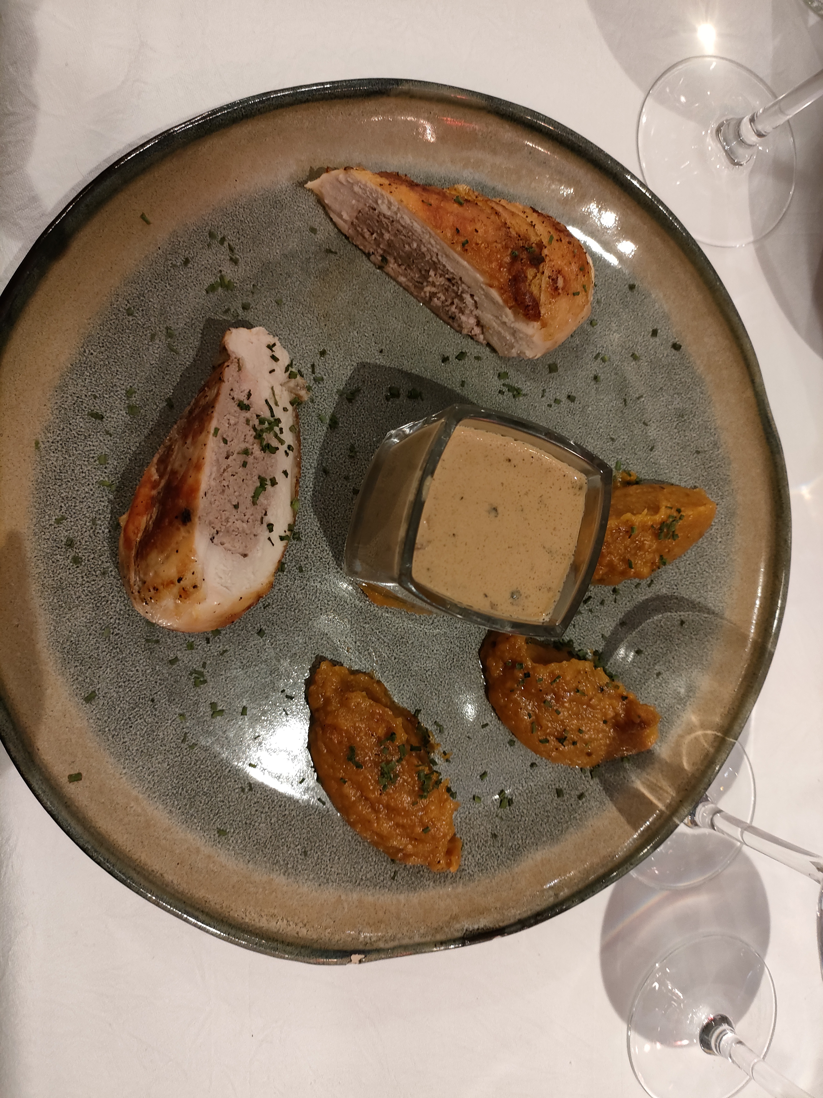 L’apéro commence avec un moucheron dans le pichet de vin blanc.. en entrée un foie gras un peu timide et 9 huîtres dont j’ai un réel doute sur la fraîcheur.. en plat une dorade grille entière (ce qui n’était pas mentionné sur la carte, donc petite surprise à l’arrivé du plat) avec un accompagnement de légumes d’automne très peu cuit pour l’autre plat saint Jacques et tribologies de purée (ça ne casse pas trois pattes à un canard mais passable).. pour les dessert un chou garni au pralin qui aurait pu être fait avec un chou congelé et de la crème dessert mont blanc .. assortiment de fromage plutôt bon mais une touffe de salade peu fraîche et flétries au centre de l’assiette est venu gâché la fête, qui était déjà plutôt mal démarré.. bref on ne refera pas !