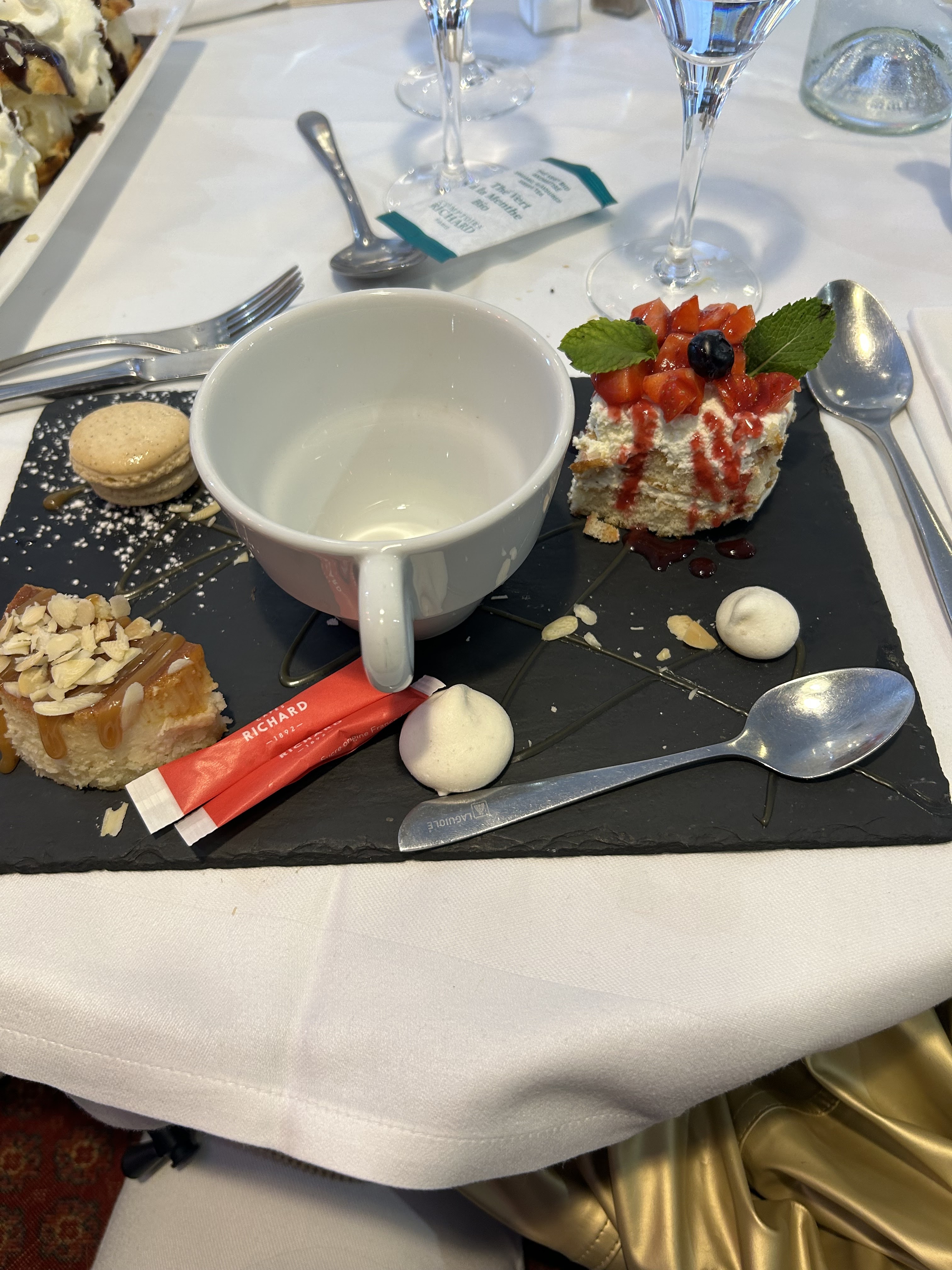 Entrée et plat apprécié mais les desserts ne sont pas fameux.. Surtout le délice de la régence : un gros gâteau au chocolat qui bourre à la première bouchée.