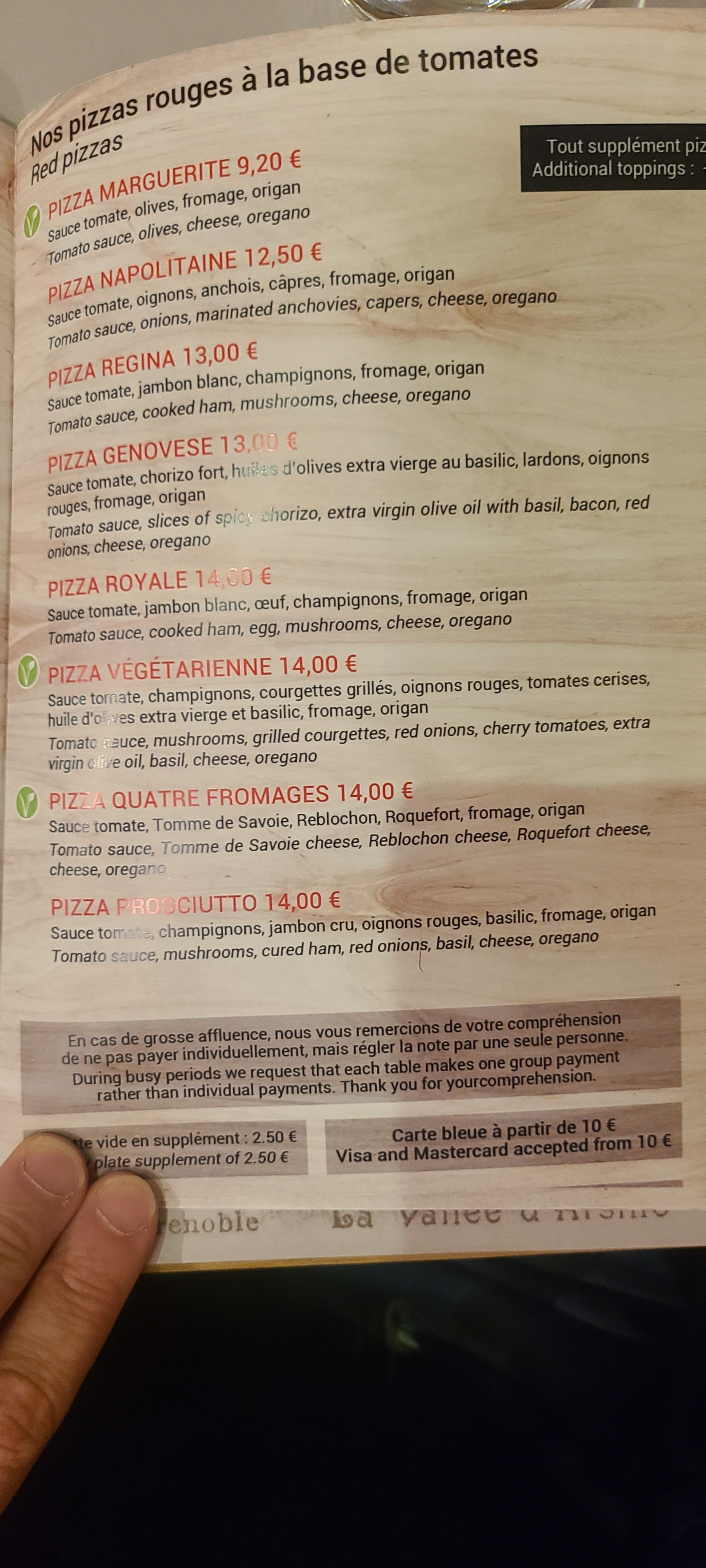 Carte trop chargée pour que les repas soient fait maison. Pizza pas fou à 15e! Sur la carte, il est inscrit 1paiement par table en cas de service soutenu. Or il me semble que cela est interdit ! Vu le climat actuel une seule personne doit payer pour 6 ou 10!!! Alors que lorsque nous sommes allés régler,nous étions les seuls à vouloir payer et le patron n'était pas pressé ! Il a quand même fallu qu'une personne paye pour toute la table! Inacceptable !! A bannir ! Merci au serveur quand même.