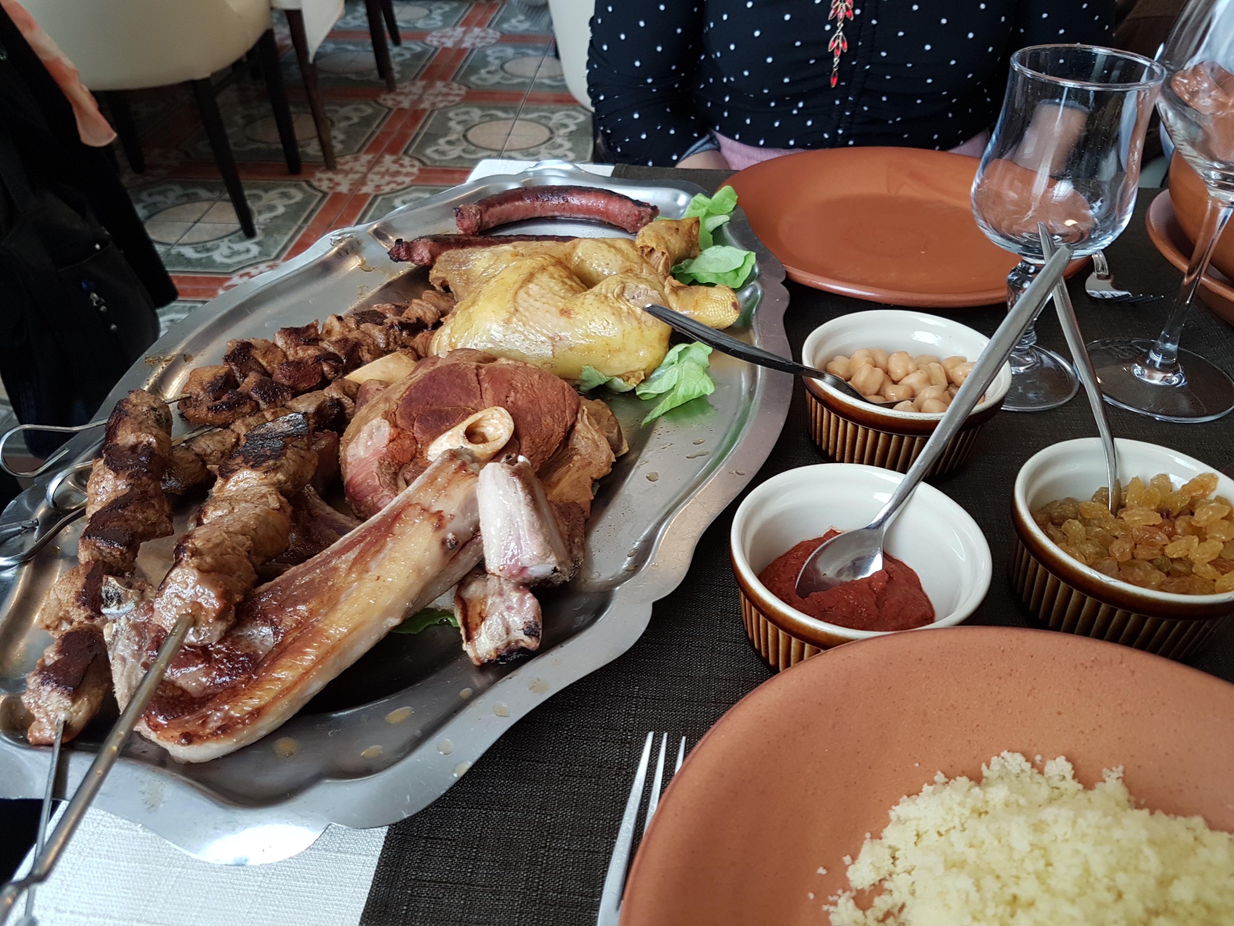 Couscous excellent, mais trop peu de pois chiches. Pâtisseries orientales décevantes, sur 4 pâtisseries, 2 sont identiques. Un verre ébreché, une vis qui dépasse de l'assise de ma chaise et qui aurait pu déchirer mon pantalon et me blesser.