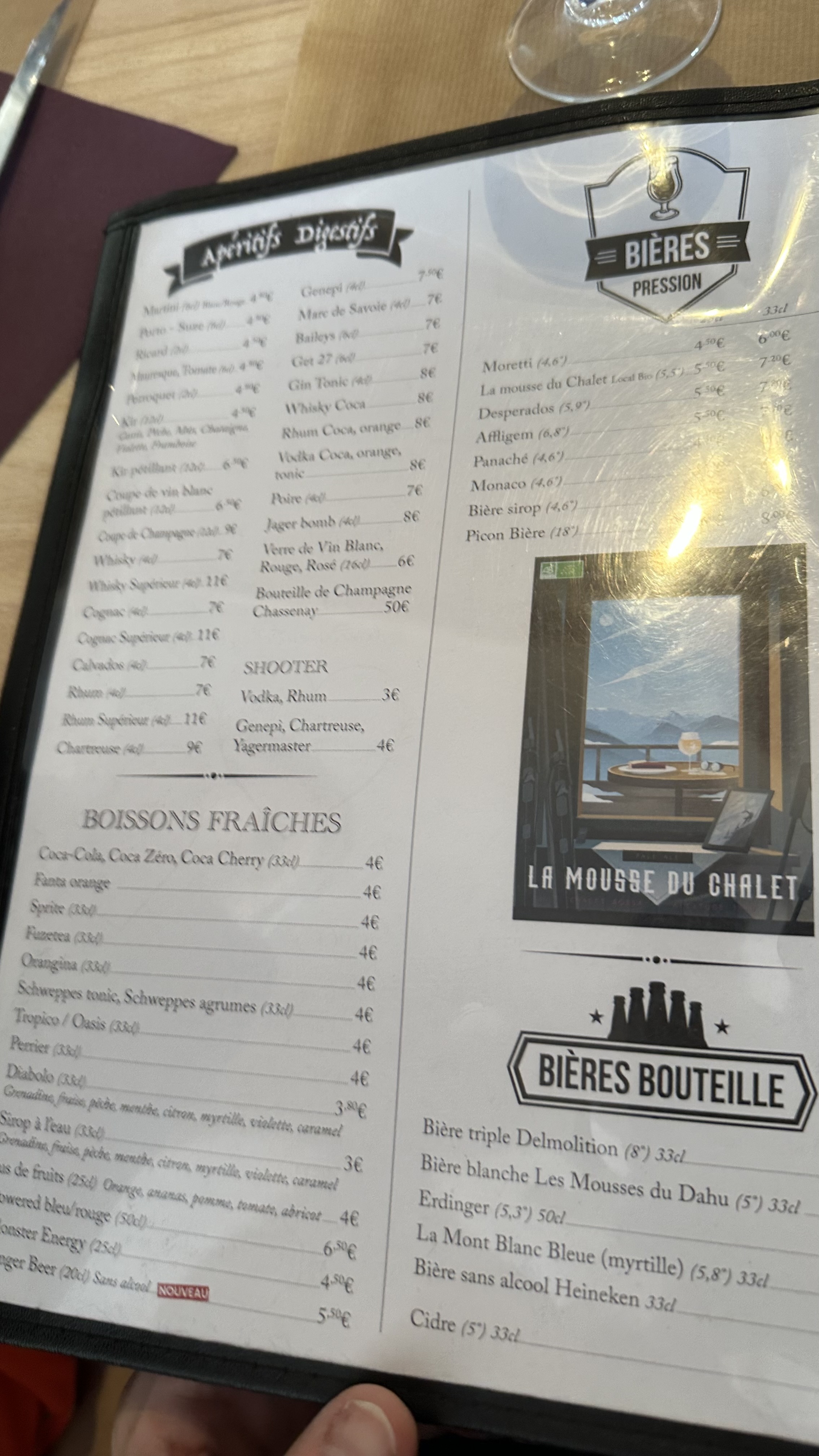 Prix très élevés, mais bon c’est la norme pour ces bars de montagne. Le cadre est magnifique et les plats / boissons disponibles variés. Je recommande pour se reposer entre deux sessions de ski.