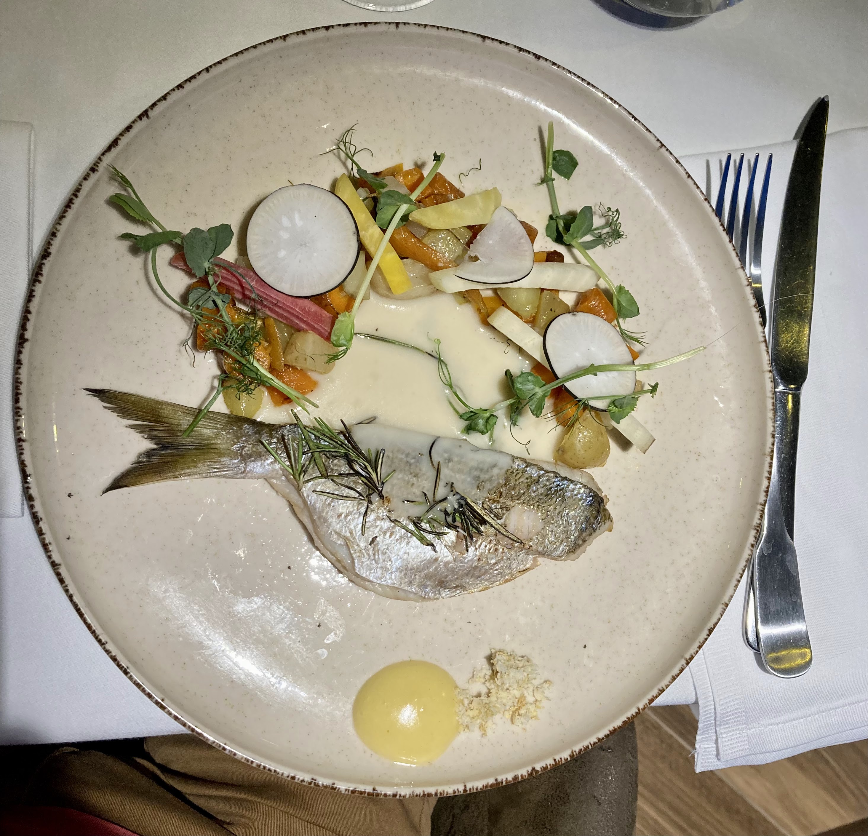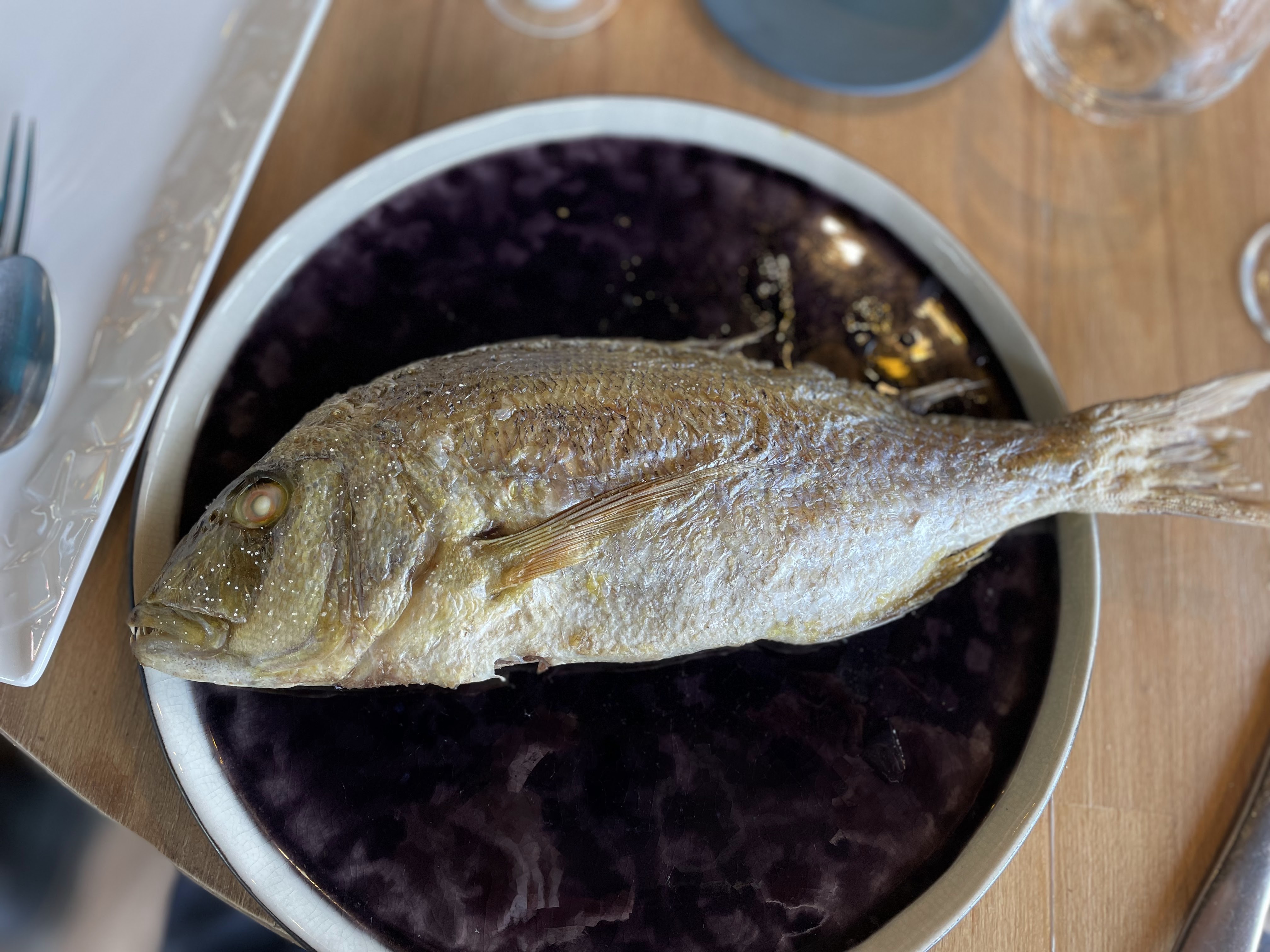 Le poisson du jour en plat principal n'était pas très grand, accompagné de quelques morceaux de tomates cuites. Pour 31 euros, je trouve cela excessif. Nous avons abrégé notre repas.