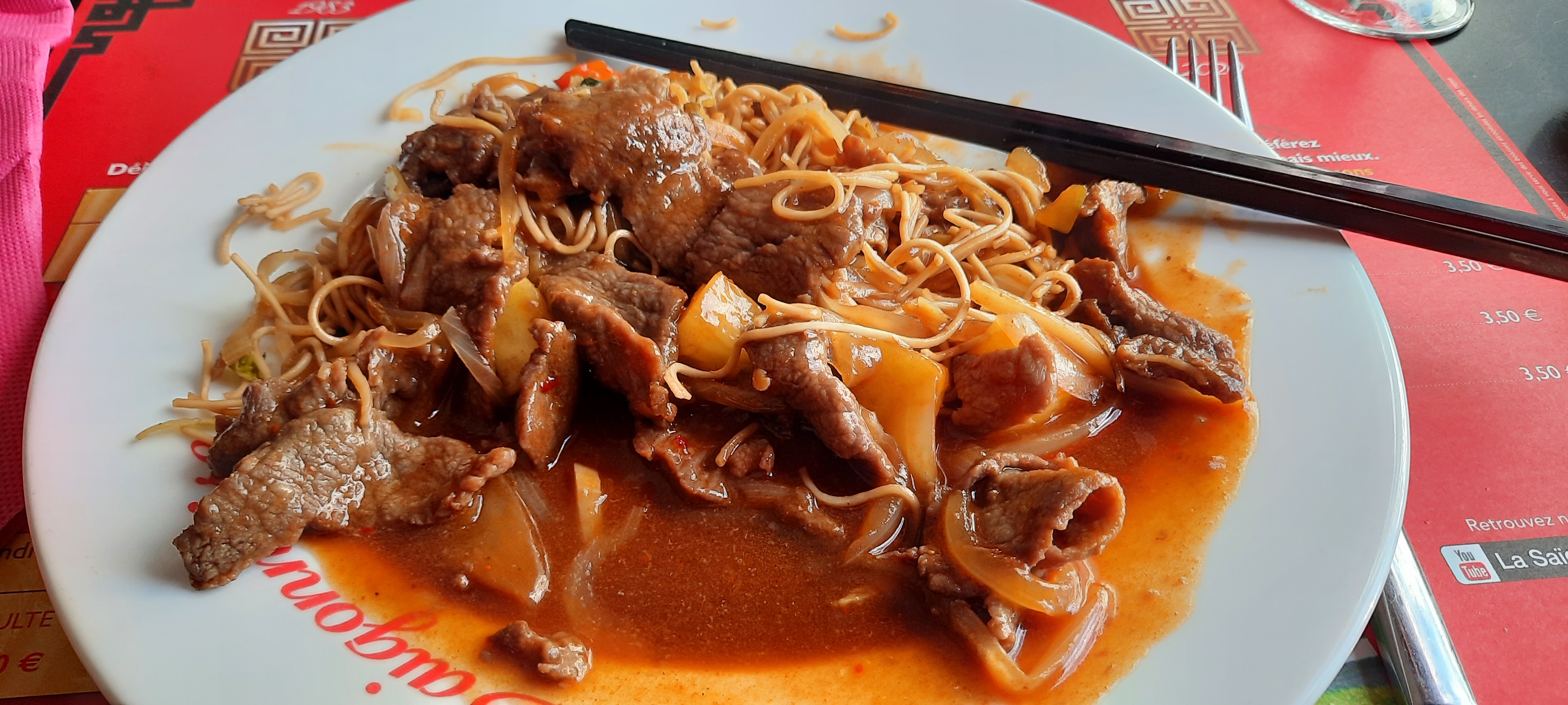 C’est la première que je prenais des plats à emporter dans ce restaurant. Les plats sont vraiment très bons : porc au caramel et bœuf au saté accompagnés de nouilles sautées et riz cantonais ! Parfait !