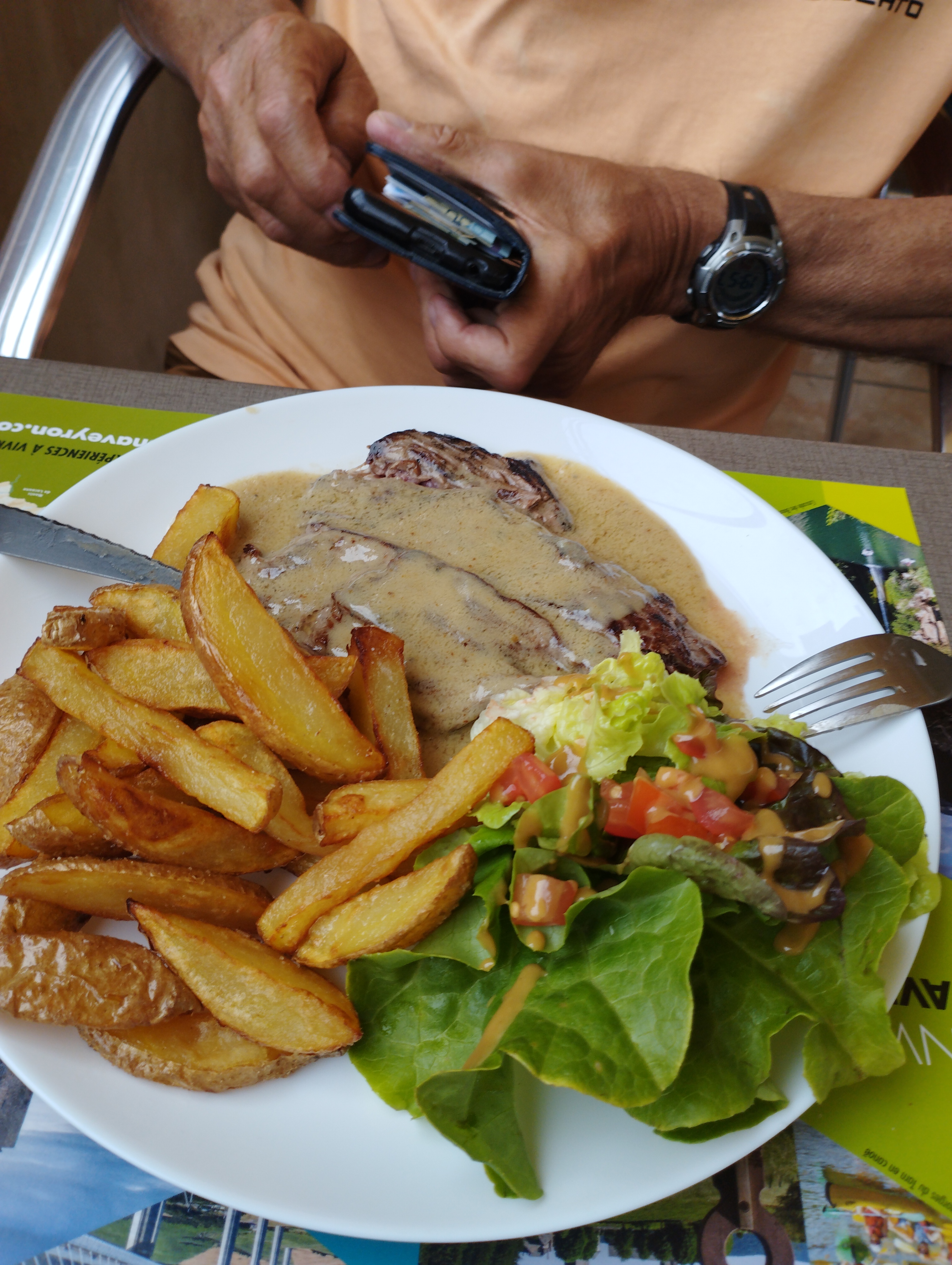 Aster Najacois servi avec Aligot et Salade, spécialité de Najac, ... 👍👍👍 Aucun regret d'avoir choisit ce plat. Très très bon, bien présenté et une serveuse au top et super sympa. Simple, mais efficace. Je reviendrai. J'ai bien aimé le passé plat improvisé par la fenêtre ... 😂😉