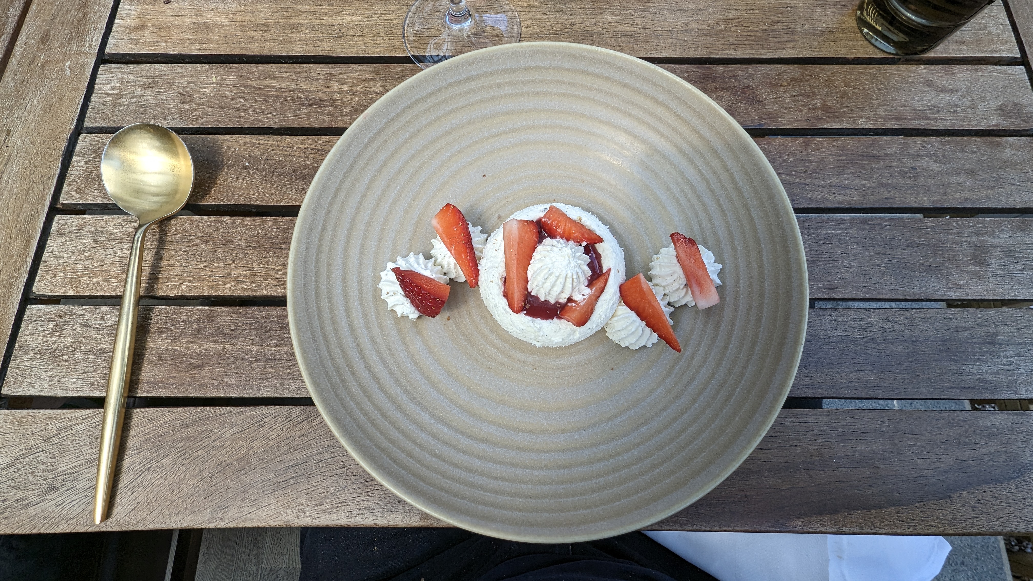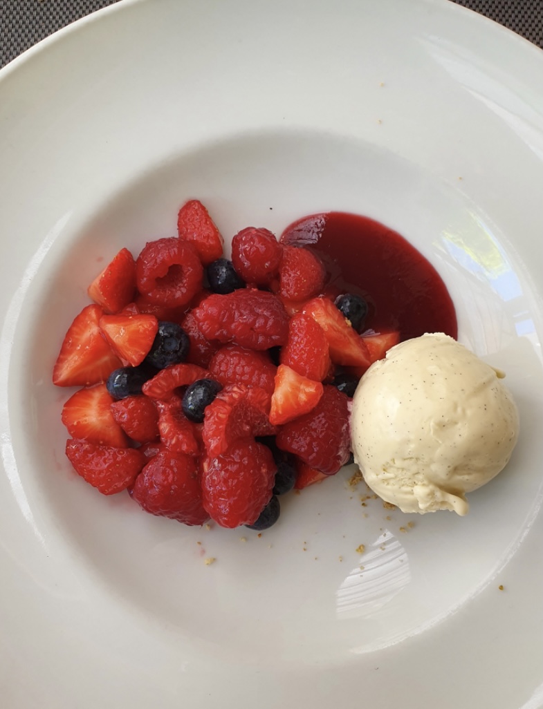 Bon et véranda agréable. Le service est un peu lent (apéritif, service du vin) mais le personnel est aimable. Ils ont une sorte de système un peu étrange, tout la tablée doit soit prendre à la carte, soit un des deux menus (un peu contraignant surtout si une personne est végétarienne!). C'est soit tout le monde prend le menu ou personne, c'est assez étonnant comme manière de faire. J'ai pris un risotto aux truffes d'été, pas assaisonné, relevé à mon goût, j'ai trouvé ça un peu fade malgré la présence de truffes. Le dessert (galet) était vraiment bon, j'ai goûté le dessert mûre qui était top aussi.