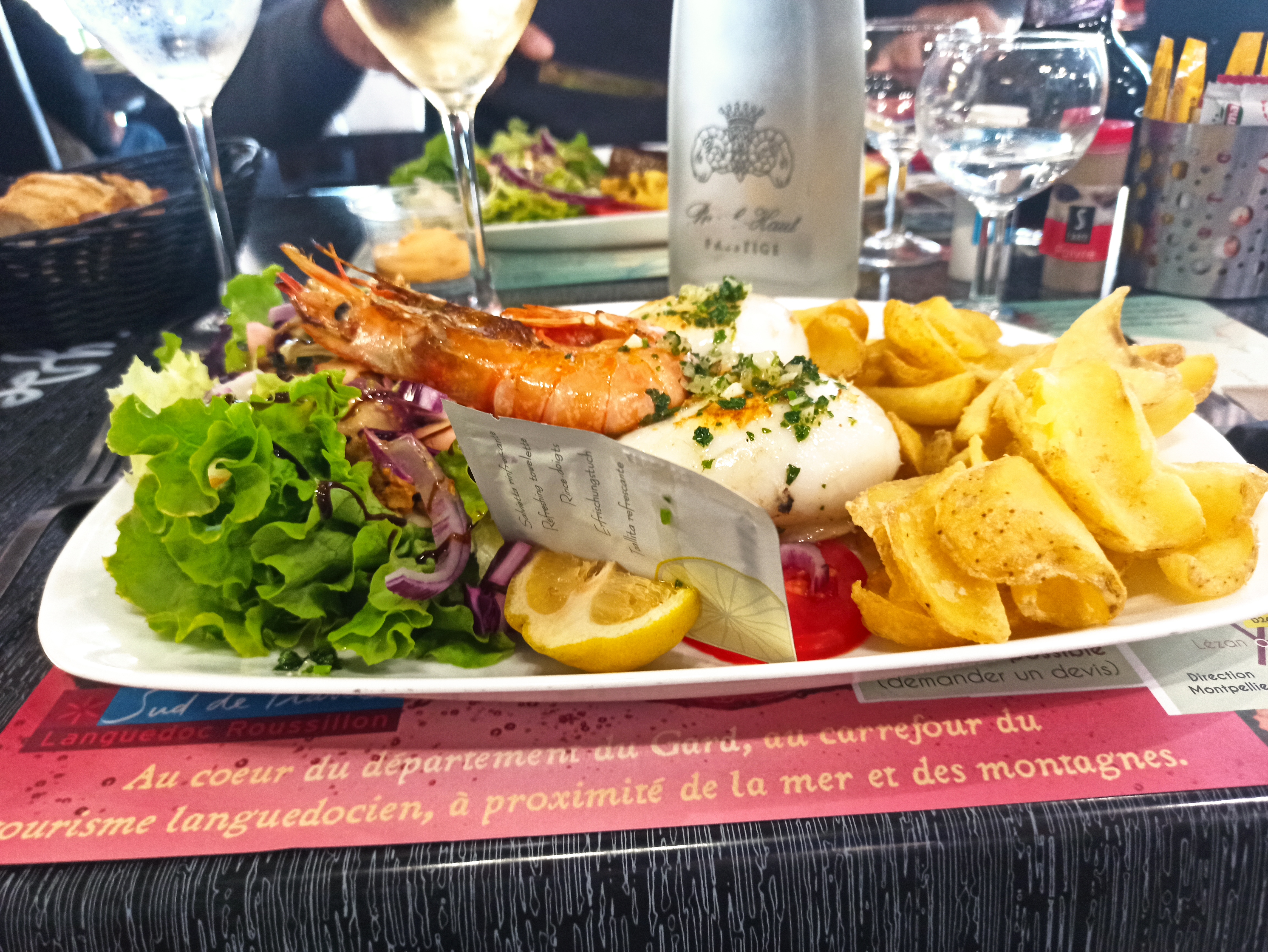 Accueil et lieu sympathique, nous avons été servi rapidement avec de très belles assiettes. Mon mari a pris un beau pavé de l'Aubrac avec des frites, il s'est régalé, ma fille un hamburger savoyard/frites, idem, assiettes copieuses et moi des gambas à la persillade/frites et aoili, très bonnes. A un prix tout à fait raisonnable.