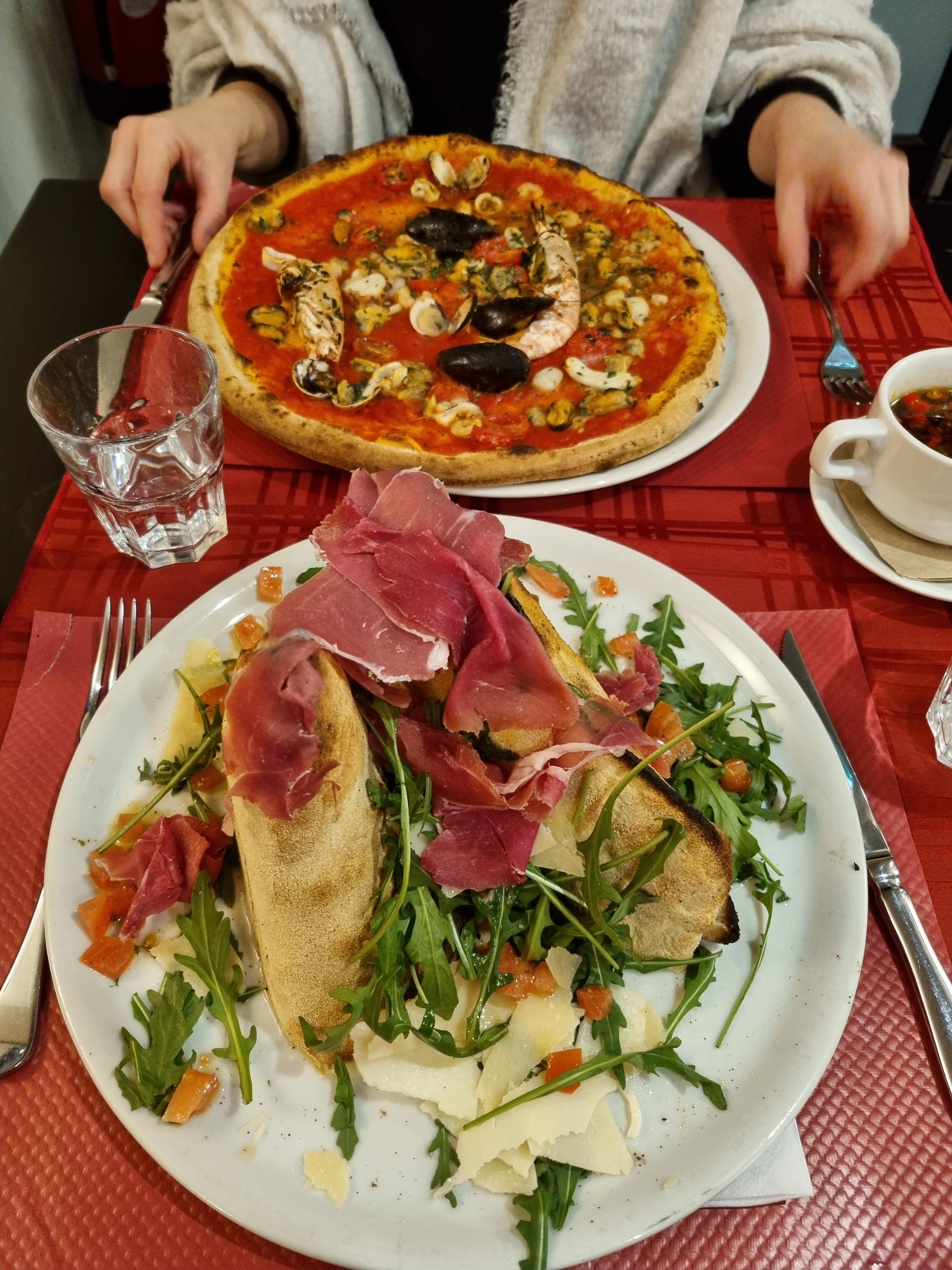 Bonjour nous avons manger aujourd'hui pris apéritif eu une bruschetta avec. Mon mari a pris une pizza savoyarde très bonne ,mon poison dos de dorade avec2 écrevisses et 2gambas accompagné de pomme de tere et une bonne sauce avec petite tomate dedans tout était chaud et copieux ,les serveur super même avec leur accent italien sa a leur charme .nous avons eu aucune attente il sont venus nous voir pour savoir si tout aller bien et en plus il y avait du monde. Et pour la note prix très raisonnable. Et bizzard les table était dresser avec couvert et verre et serviette 😊👍