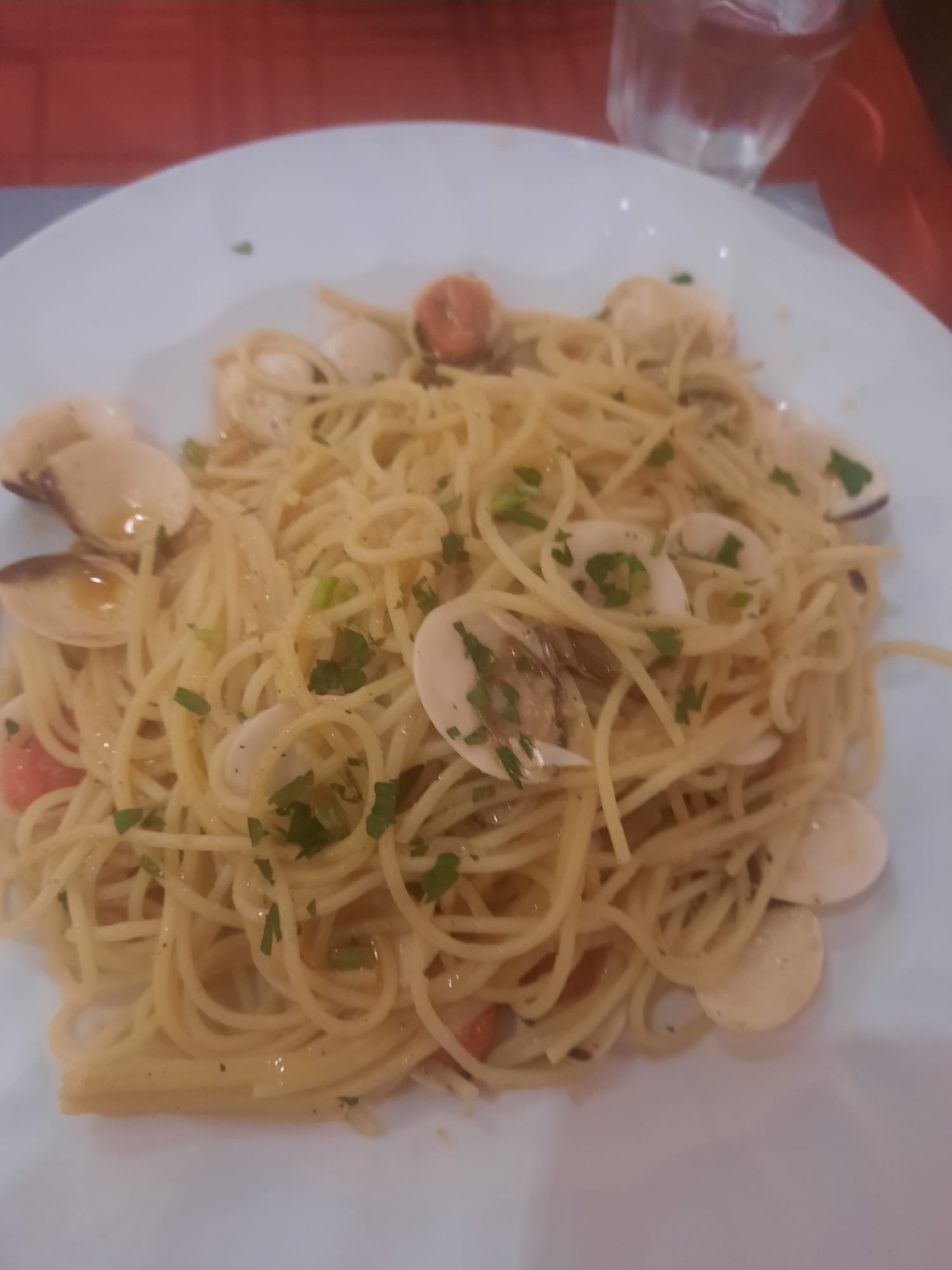 La zone est assez bruyante dans la soirée, avec les voitures et les motos. La pizza Al Tartufo était très bonne, nous avions demandé une Calzone sans champignons, mais ces derniers n’ont pas été retirés. Le plat de pâtes contenait un peu trop de sauce. Nous avons mis du temps à obtenir une carafe d’eau, mais étant donné qu’il y avait pas mal de monde (21h), c’est compréhensible.