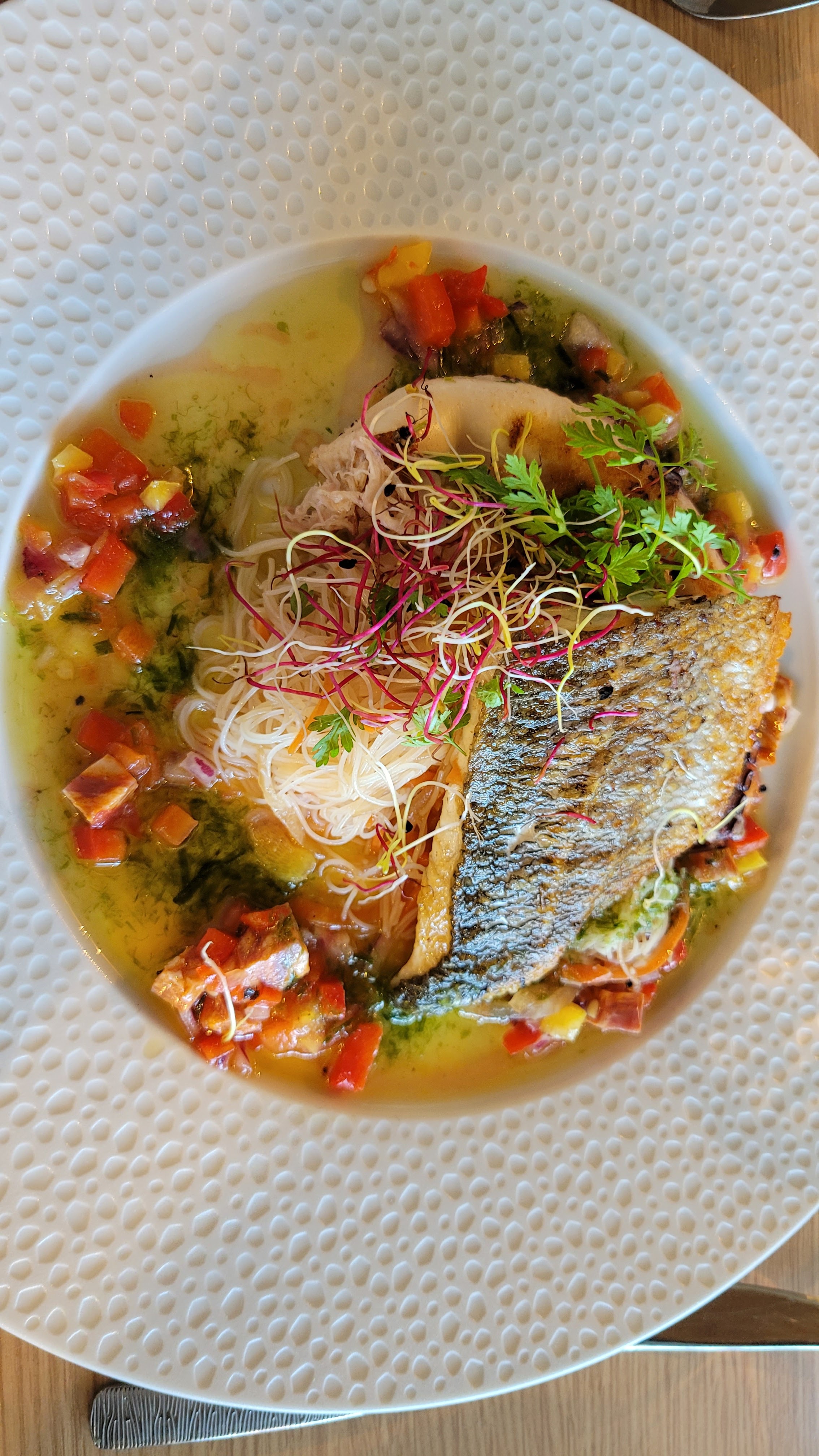 Très beau cadre, service souriant et efficace. Nous avons choisi le tartare de dorade et le poulpe et dorade avec wok de légumes : délicieux. Pour le desser, la soupe de myrtilles et le croquant chocolat etaient parfaits. Très beau moment. Merci à vous