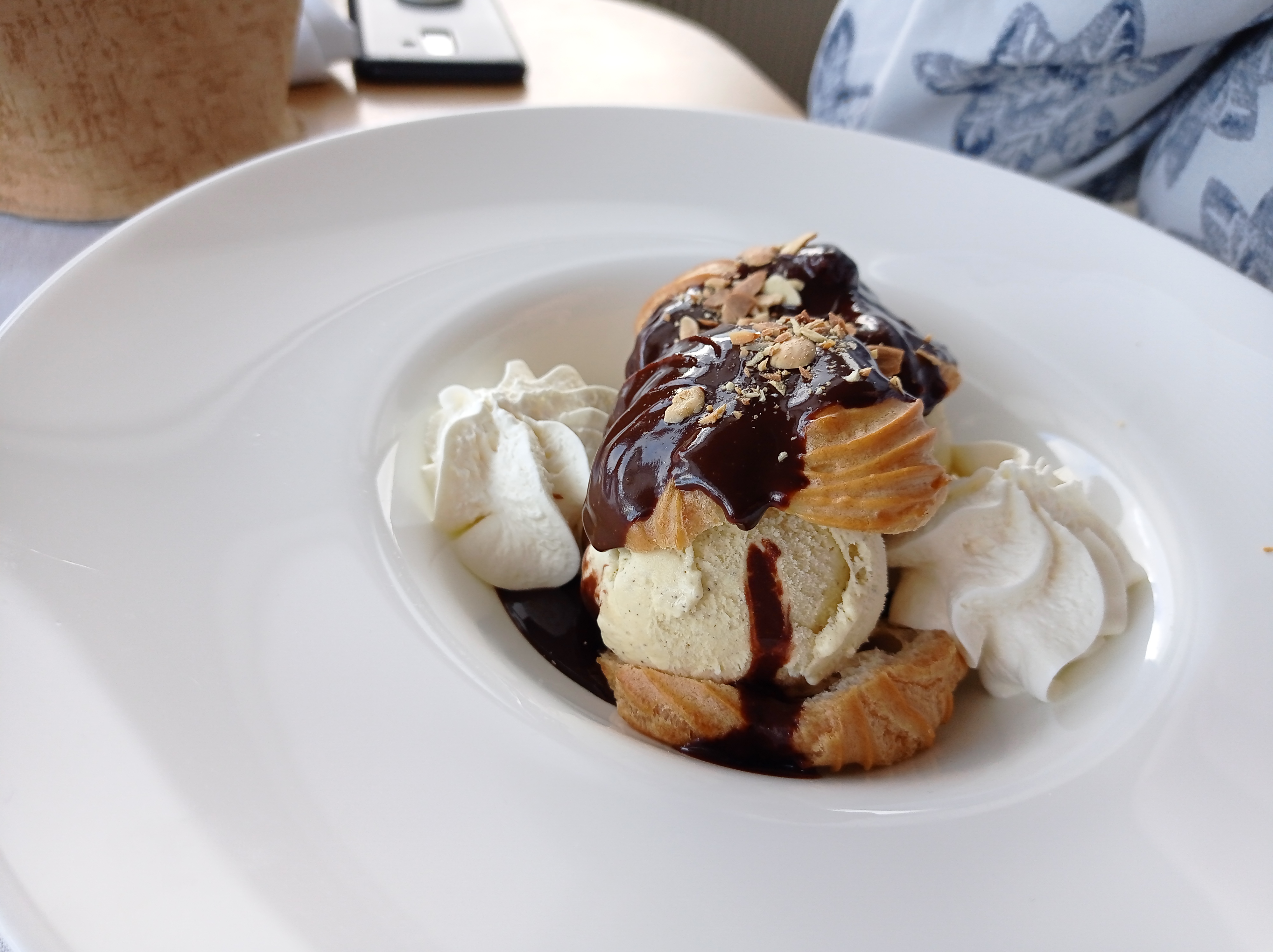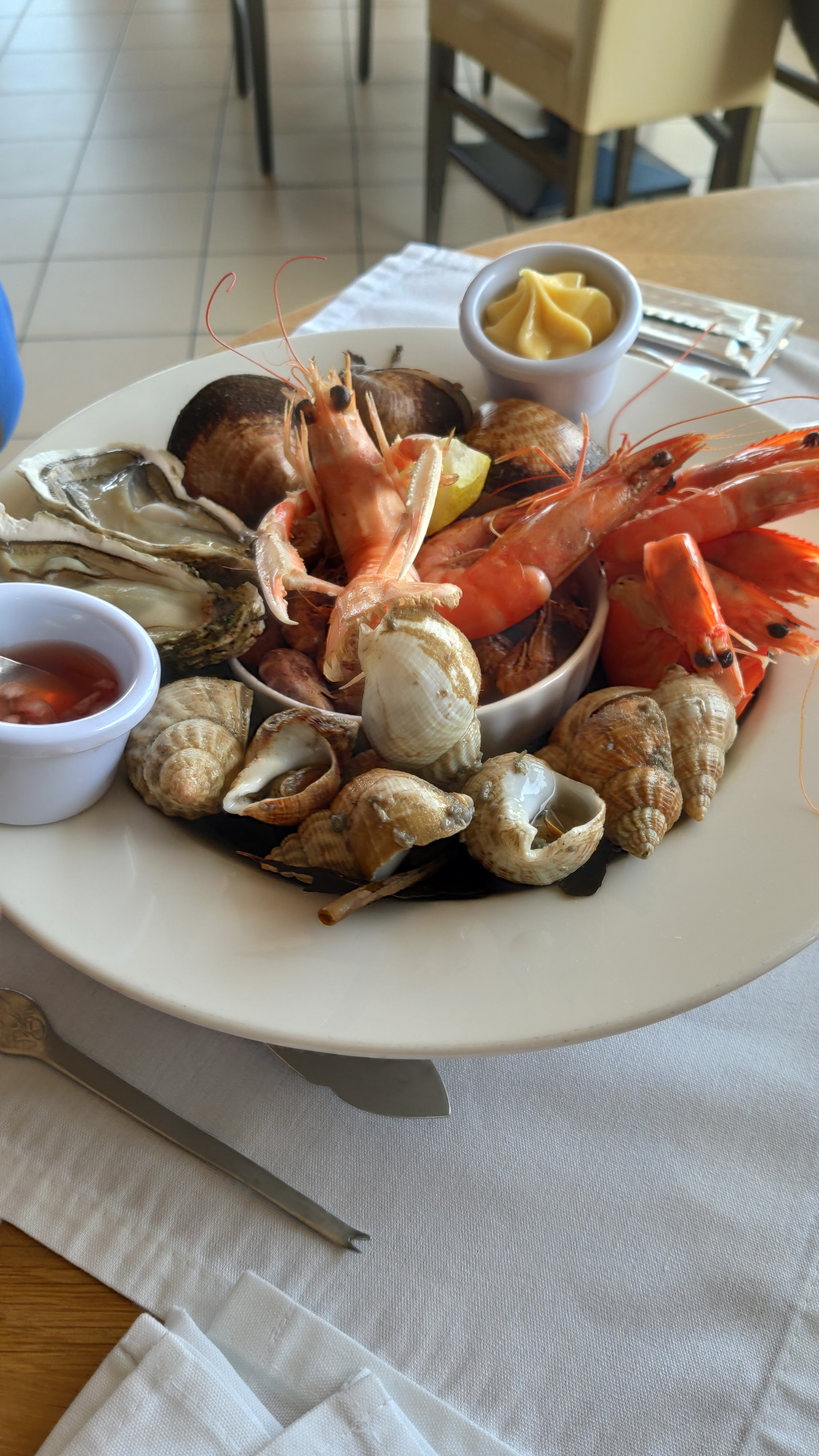 J'avais envie d'un bon plateau de fruit de mer , je suis ravi ! La fraîcheur , la qualité, le service , la gentillesse et le cadre magnifique en face de la mer avec le soleil éclairant le Cap ... What Else ... Peut-être quelques profiteroles 😉👍 J'étais seul , à la table 51 ... du bonheur Merciiii