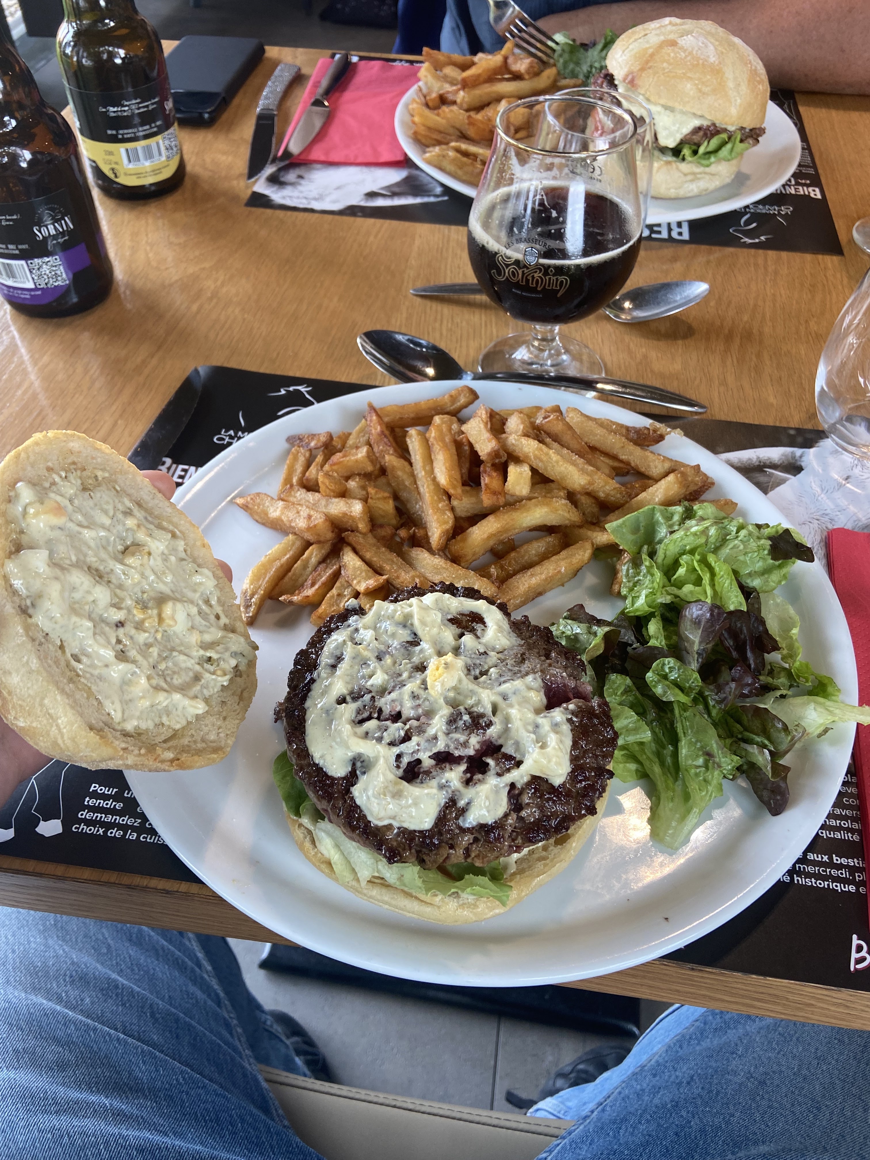De la viande charolaise 🥩 AOP tendre savoureuse. Avec des frites cuites dans le blanc de bœuf. Et une bière locale. J’y reviendrai avec plaisir. Je vous le recommande