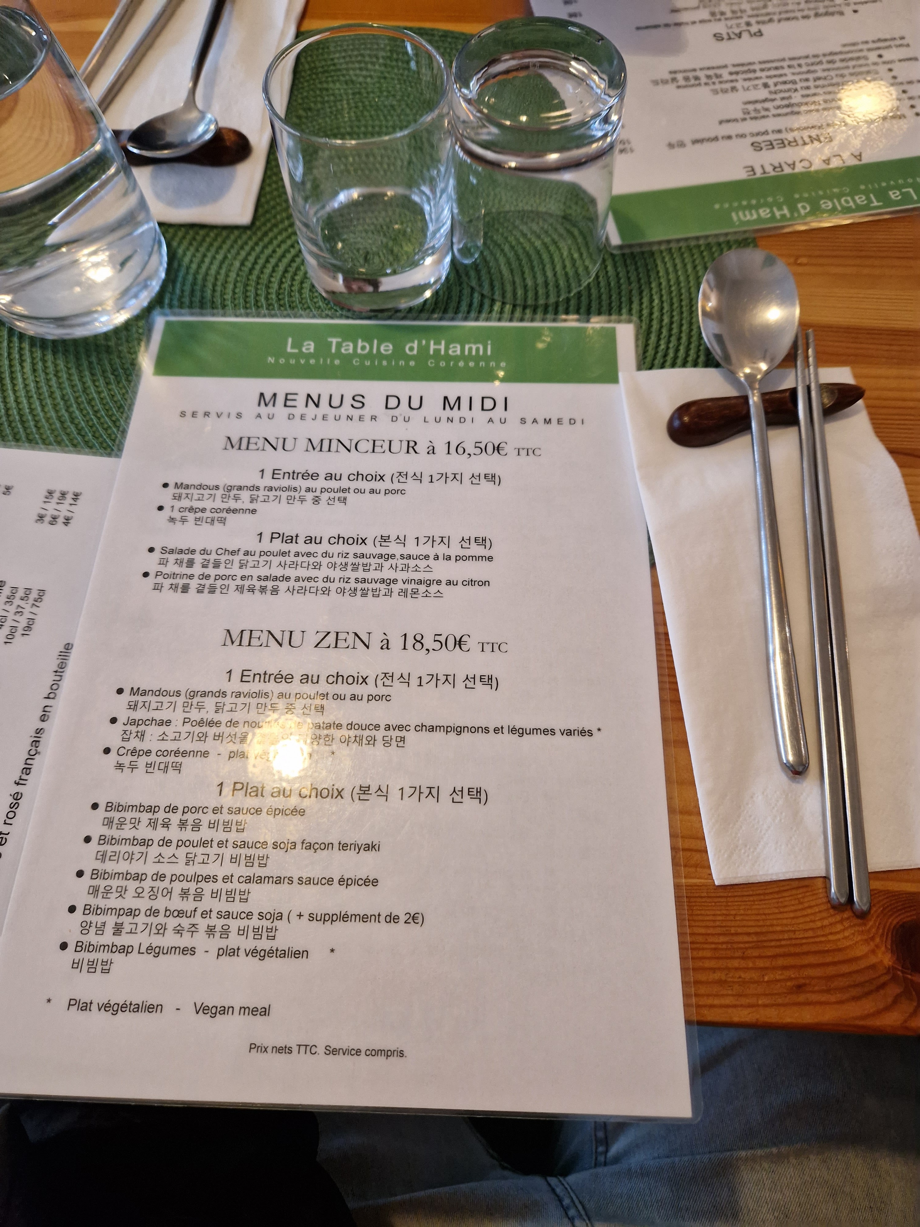 Nous n avions jamais mangé Coréen et bien de l entrée au dessert un régal. Une nourriture saine et convenant aux végétariens, vegan et sans gluten. De plus restaurant très propre et serveurs comme cuisinière hyper accueillants, même avec 3 enfants! Situé à 2 pas du jardin des plantes donc très pratique.