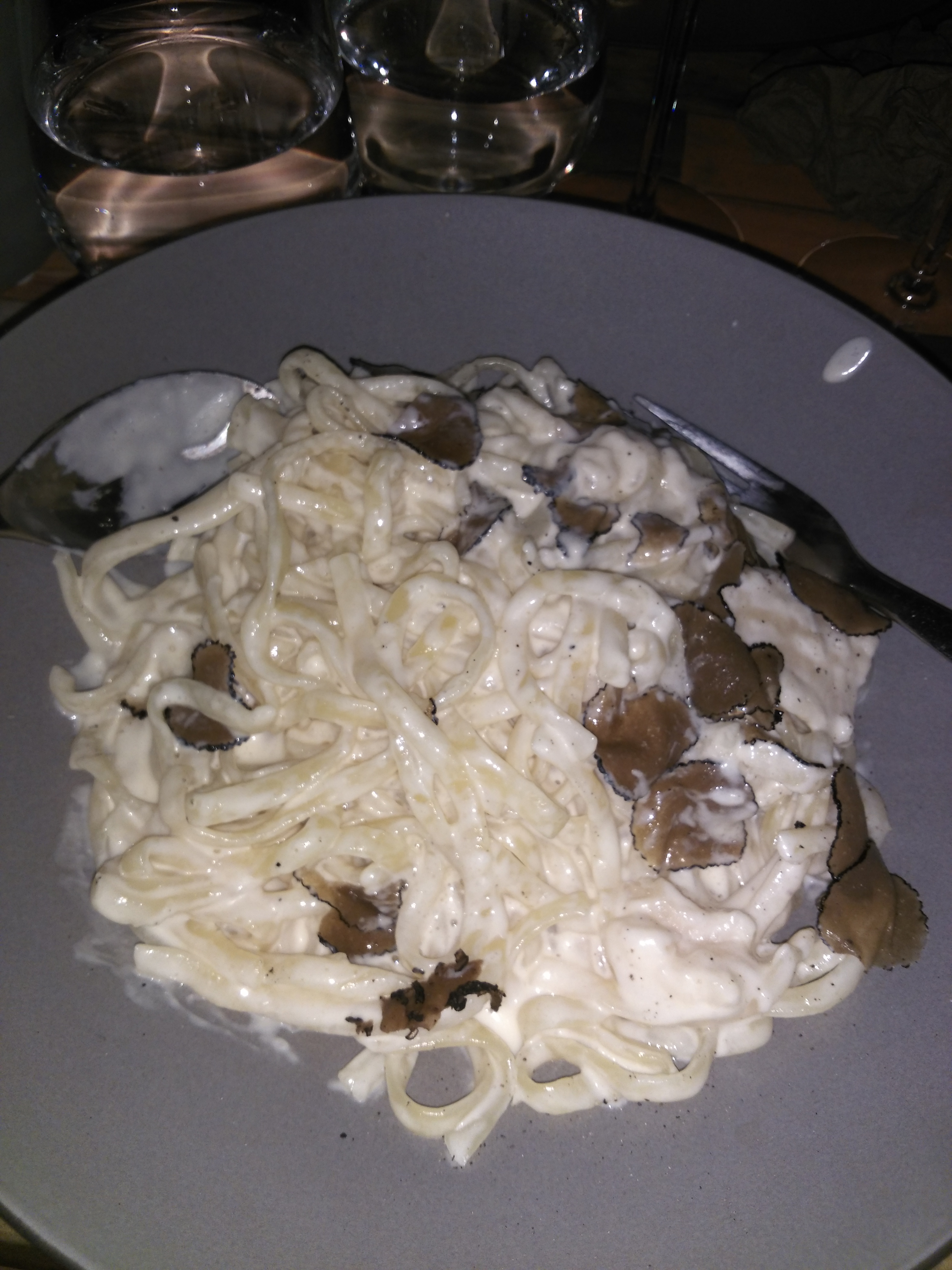 Les pâtes à la truffe dans la meule de Parmesan sont simplement bonnes. Passé le côté spectacle de la préparation, un peu du mal à trouver une plus value gustative à ce type de cuisson. Viande maturée excellente mais un peu trop chère. Globalement, bonne expérience même si le rapport qualité prix laisse à désirer.