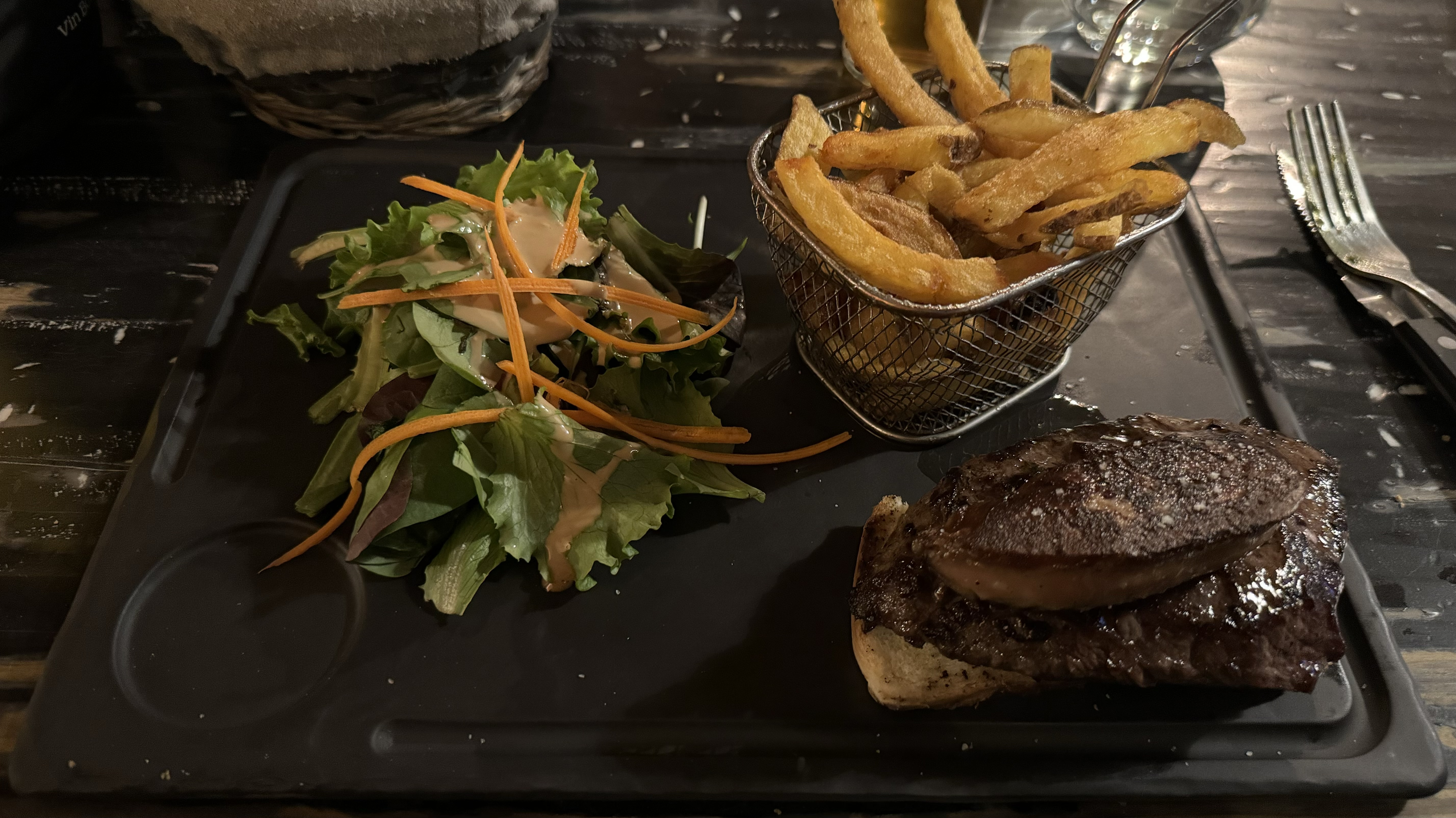 Restaurant jolie de loin mais pas très bien entretenu. On ce fait asseoir à l'étage, une toile d'araignée à la gauche de ma compagne. Du coup on change de place. On commande, le service agréable, les tapas sont arrivés vite et chaud. Passons au dîner, ma compagne prend un tartare de boeuf. Il était moyen, une grosse présence de cornichons reduit le goût du boeuf les saveurs ne sont pas homogènes. Dommage... Les frites et la salade étaient sympas. Pour moi c'est la pièce de viande avec le foie gras poêlé. Le foie gras était bon, j'aurai aimé deux tranches de pain toasté... la cuisson de la viande respectée, mais une trop grosse présence de fleure de sel qui avec l'huile de truffe masque le goût de la viande.