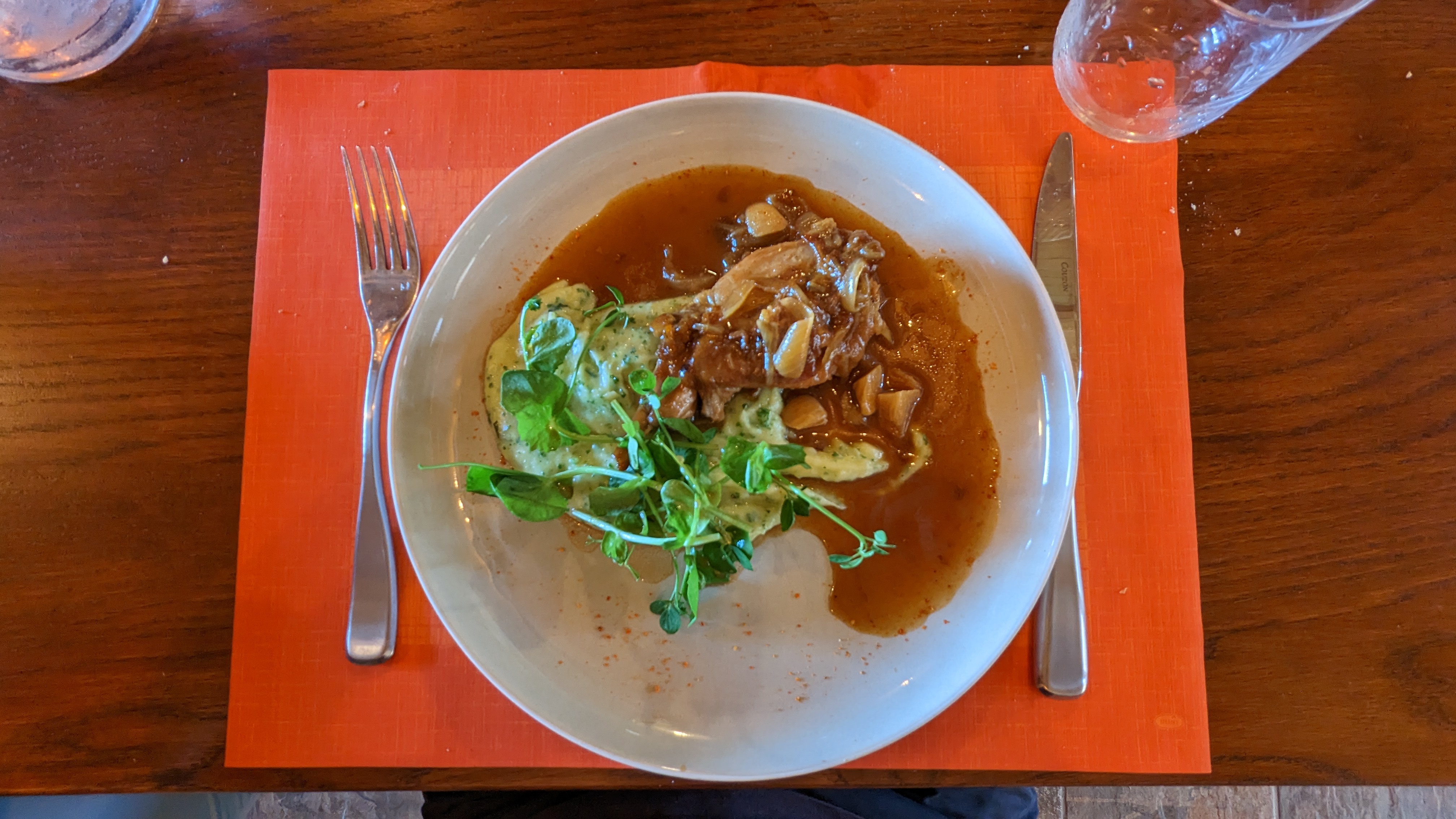 Un cadre agréable. Une excellente cuisine qu'il faut aller chercher au fin fond de la campagne. Un accueil prestigieux par un dindon majestueux. Une petite mise en bouche fraîche et légère au chèvre. Un suprême de pintade fermière aux pleurotes et écrasé de pommes de terre violettes joliment présenté, à la cuisson parfaite, tendre et à la peau bien grillée. Une sauce très goûteuse qui se marie parfaitement avec le plat. Et enfin un bon pain pour accompagner le tout. Un régal. Une bulle de réconfort dans un Have de paix. 😉 Merci pour ce moment de partage de votre cuisine.
