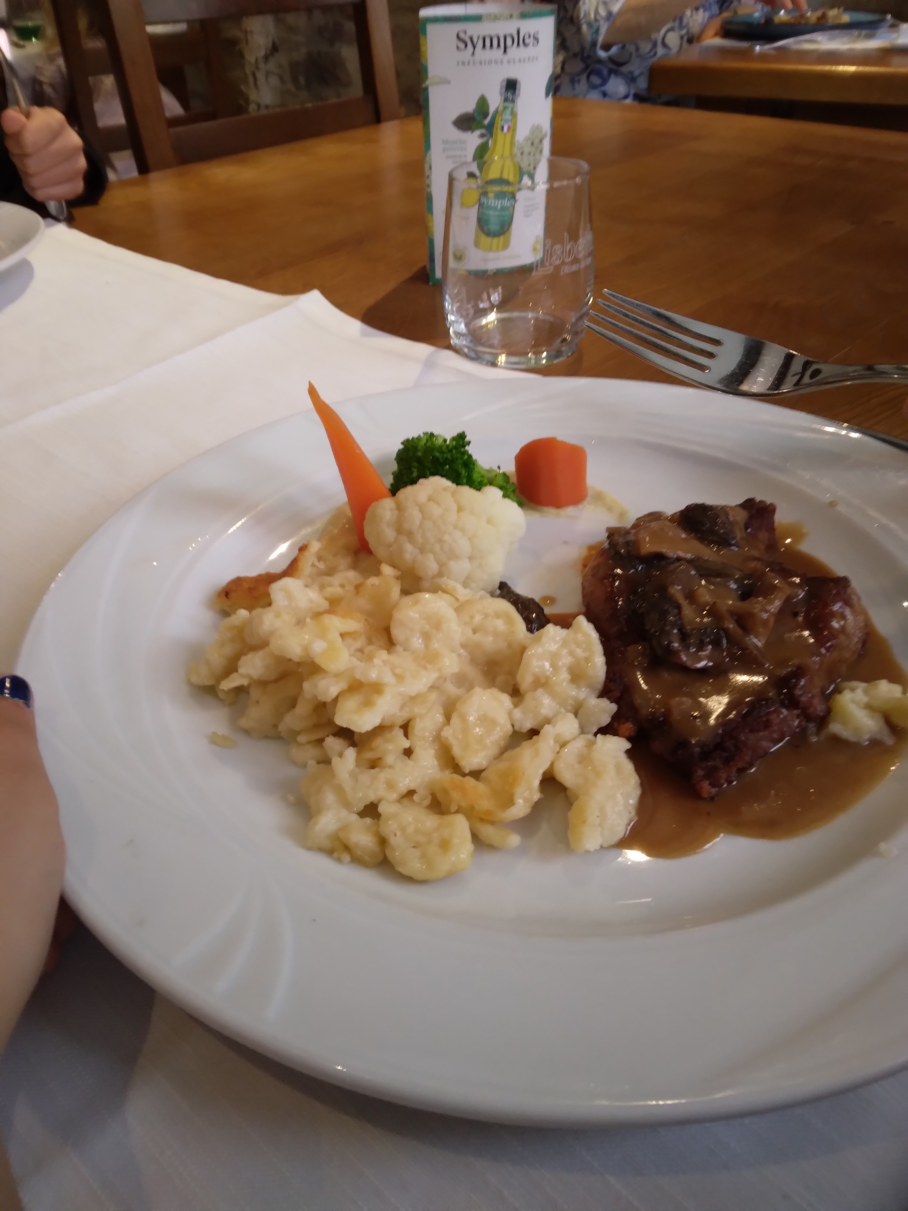 Le mardi 23 août 2022, j'ai visité le restaurant avec ma femme. Nous avons très bien mangé et bu. Comme nous n'avions pas réservé, on nous a proposé une place dans une demi-heure, ce que nous avons accepté avec plaisir. L'apéritif maison était un excellent mélange de crémant et de liqueur de poire. Délicieux. Le steak de veau aux champignons était frit à la perfection. Des légumes parfaitement cuits étaient servis sur une farce de céleri. Excellent également. Le spaetzle frit qui l'accompagnait était également très savoureux. En dessert, j'ai eu une compote de prunes avec de la glace. Tout était très, très savoureux. Le prix était raisonnable. Fortement recommandé et je serais heureux de revenir.