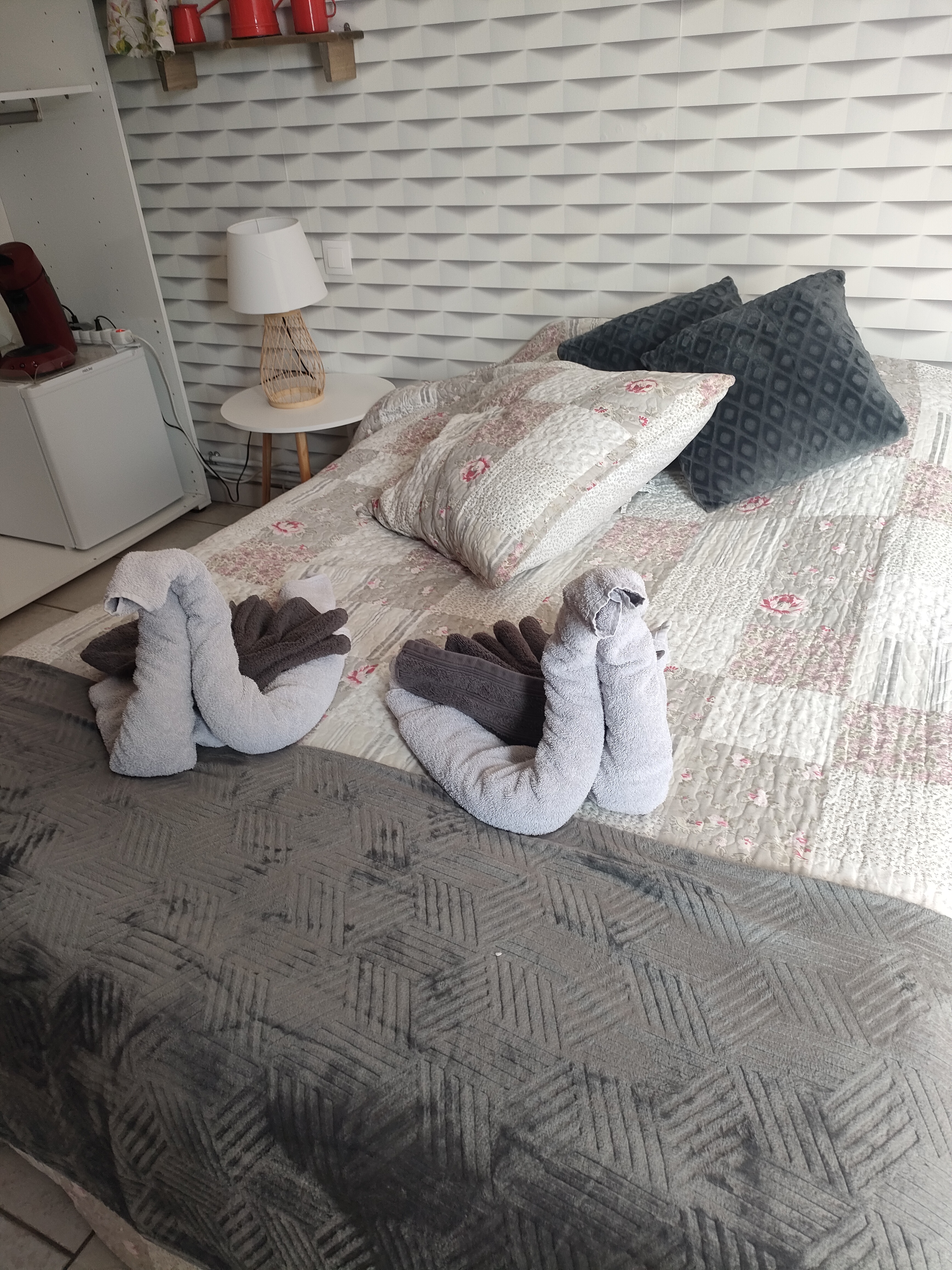 Patrons très convivial et très professionnel. A notre écoute. Emplacement très calme. Chambre très propre et bien décoré avec belle salle de douche. Plateau avec thé, café... et refrigérateur dans la chambre avec bouteille d'eau. Très bonne literie, nous avons bien dormis. Repas du soir parfait et petit déjeuner très copieux ( viennoiseries,pain confiture, fruits,jus d'orange). Je recommande à 💯%. Merci pour ce séjour qui était parfait. On reviendra. Valérie et jean Philippe