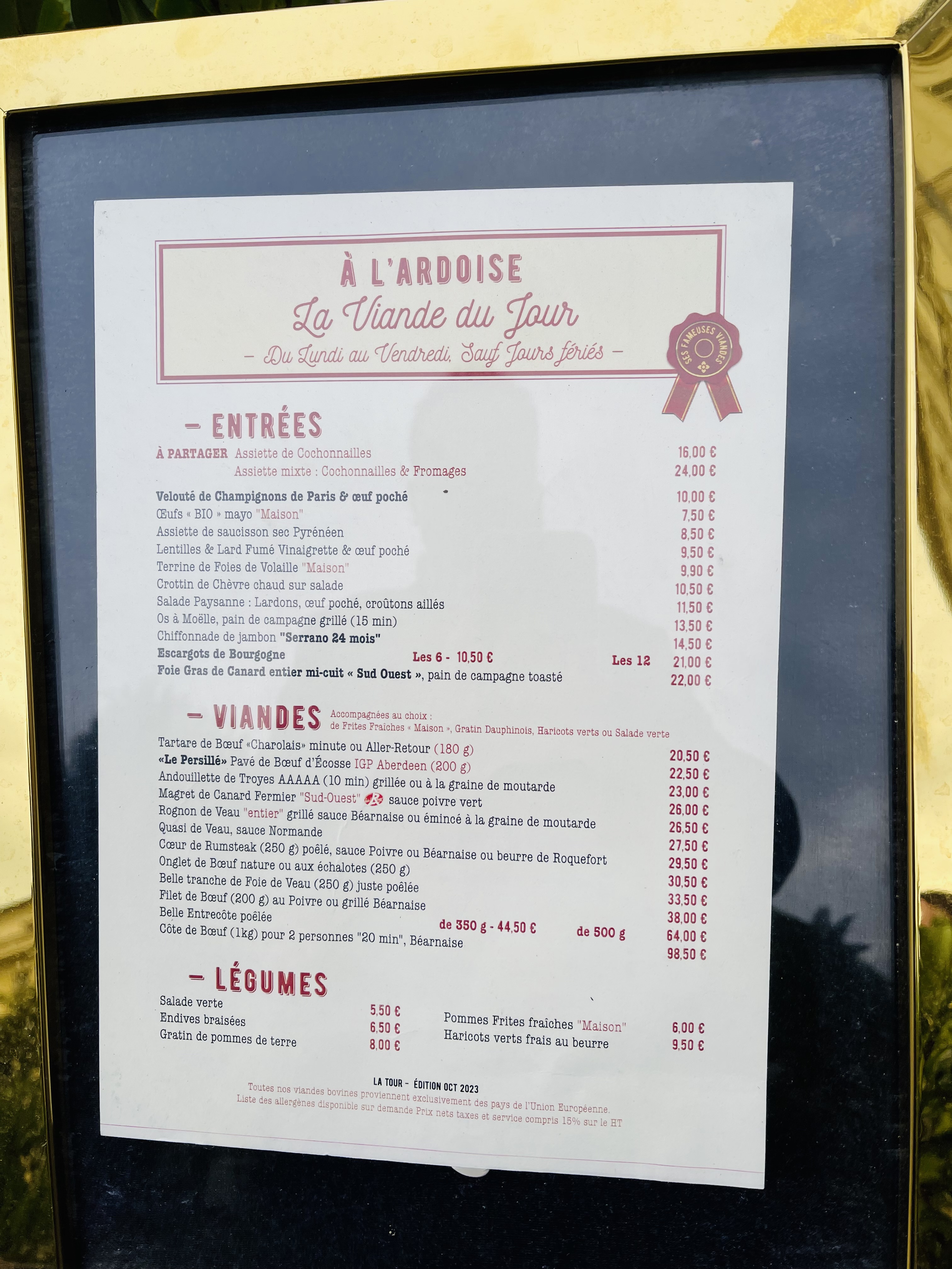 Non mais, 29€50 pour une tranche de foie, 23& pour une bavette à l'échalote, 26€ pour 50 CL de vin, un Saumur paraît il..... C'était bon mais cher, ambiance glaciale autant au niveau service que salle, 70€ pour juste 2 plats et demi carafe de vin, ça sent le foutage de gueule (restau le 12 juillet au soir)