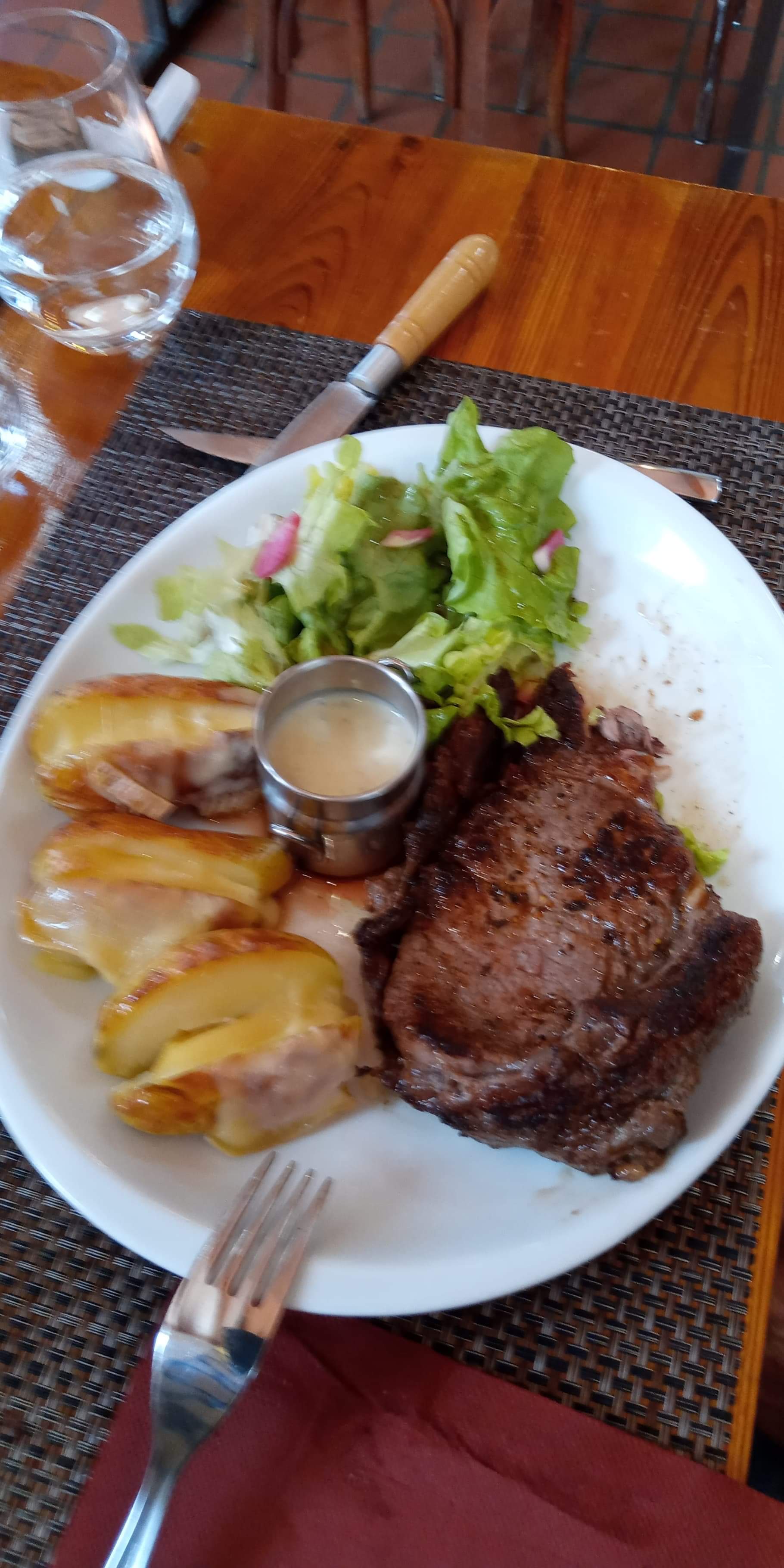 Première expérience dans ce restaurant de pays, entrée ris de veau exceptionnel, bavette je crois la meilleure que j'ai mangé, dessert moelleux très bon, et petit dijestif offert par le patron, serveuse, très très sympathique et professionnel, je recommande vivement Merci encore pour se bon moment