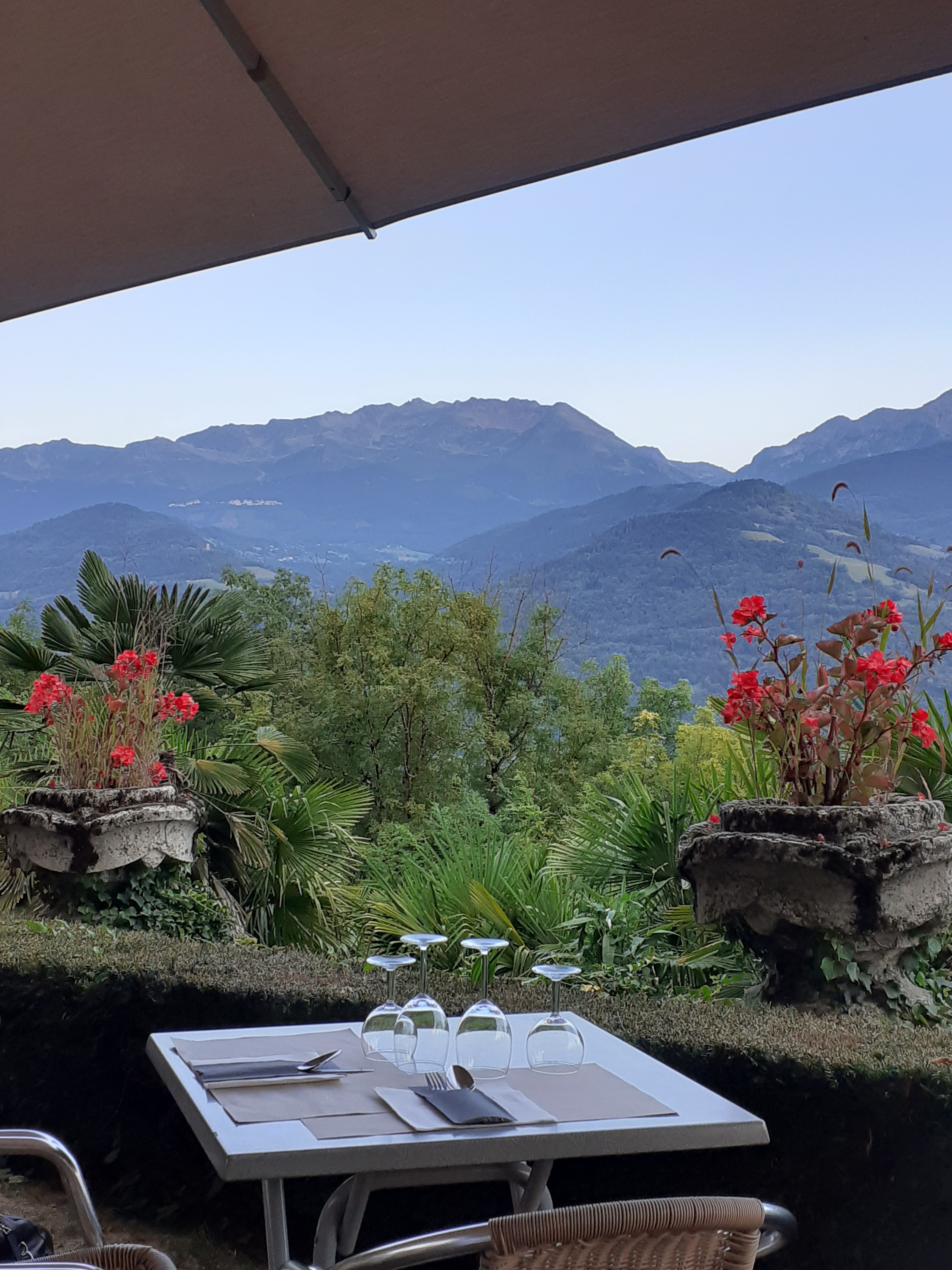 Repas à midi en terrasse, vue splendide sur Belledonne, les trois pics en vue imprenable. Parking aisé a portée de l entrée du restaurant. On s empresse de vous accueillir et s est très agréable. La terrasse est grande a l abri de grands parasols. Ma femme et moi prenons le menu du jour a 27€. Entrée, plat dessert, belle présentation et bien gourmand, on s est regalé. A refaire pour anniversaire ou autre occasion.