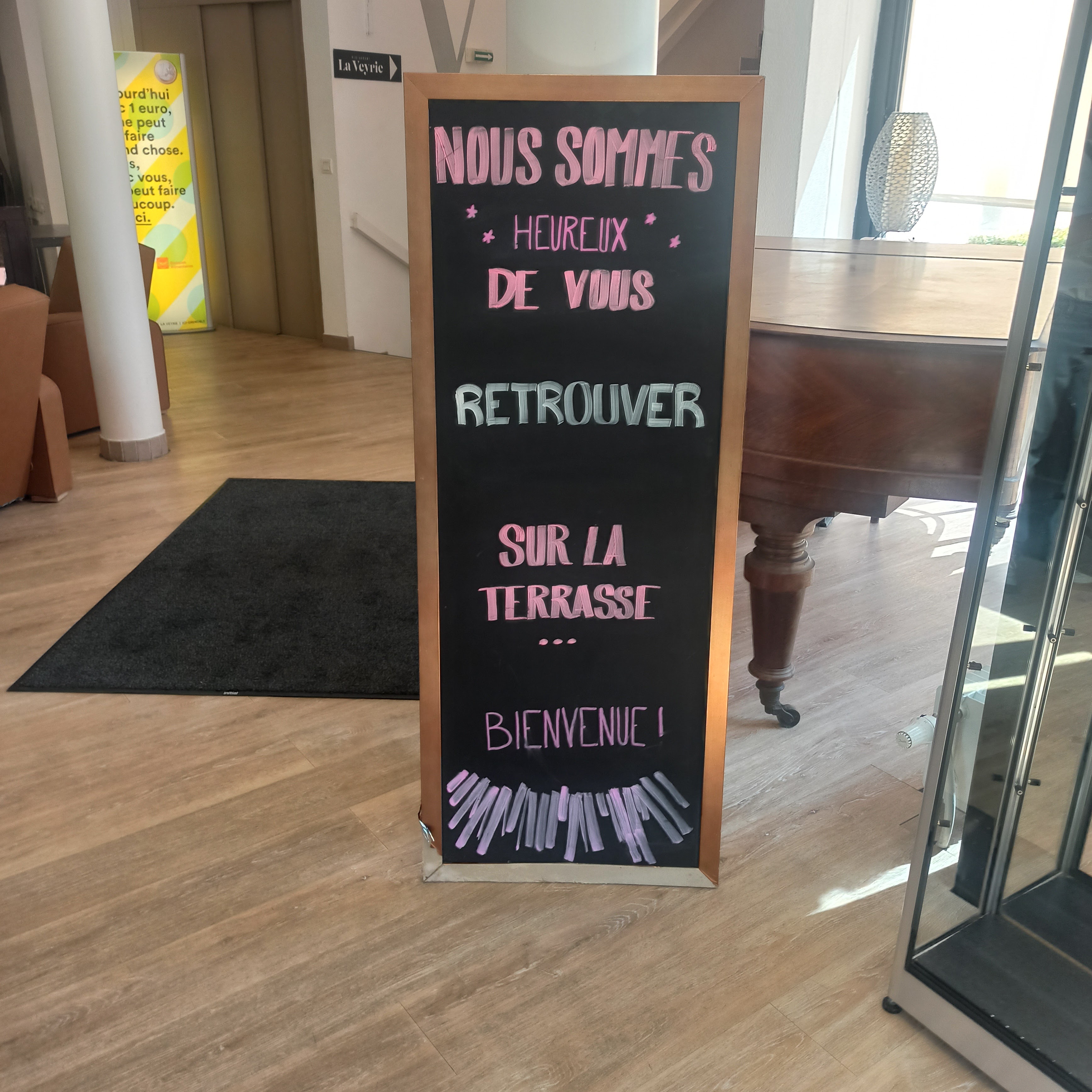 Suite a notre réservation dix jours auparavant , a l'arrivée au restaurant ma femme a eu la mauvaise surprise de voir qu on nous avait mis une table dans le hall d'entrée entre la porte d'entrée et les toilettes . L'intérêt de la Veyrie c'est la vue sur les montagnes depuis la salle du restaurant ou la Terrasse si le temps le permet . Ma femme demande s'il est possible d'avoir une table dans la salle et la réponse de la personne a l'accueil a été 'non c'est comme ca'. Bonjour l'accueil ! Il serait bon de prévenir a l'avance si on est installé dans le hall d'entrée . La différence de prestation avec la salle du restaurant est majeure .