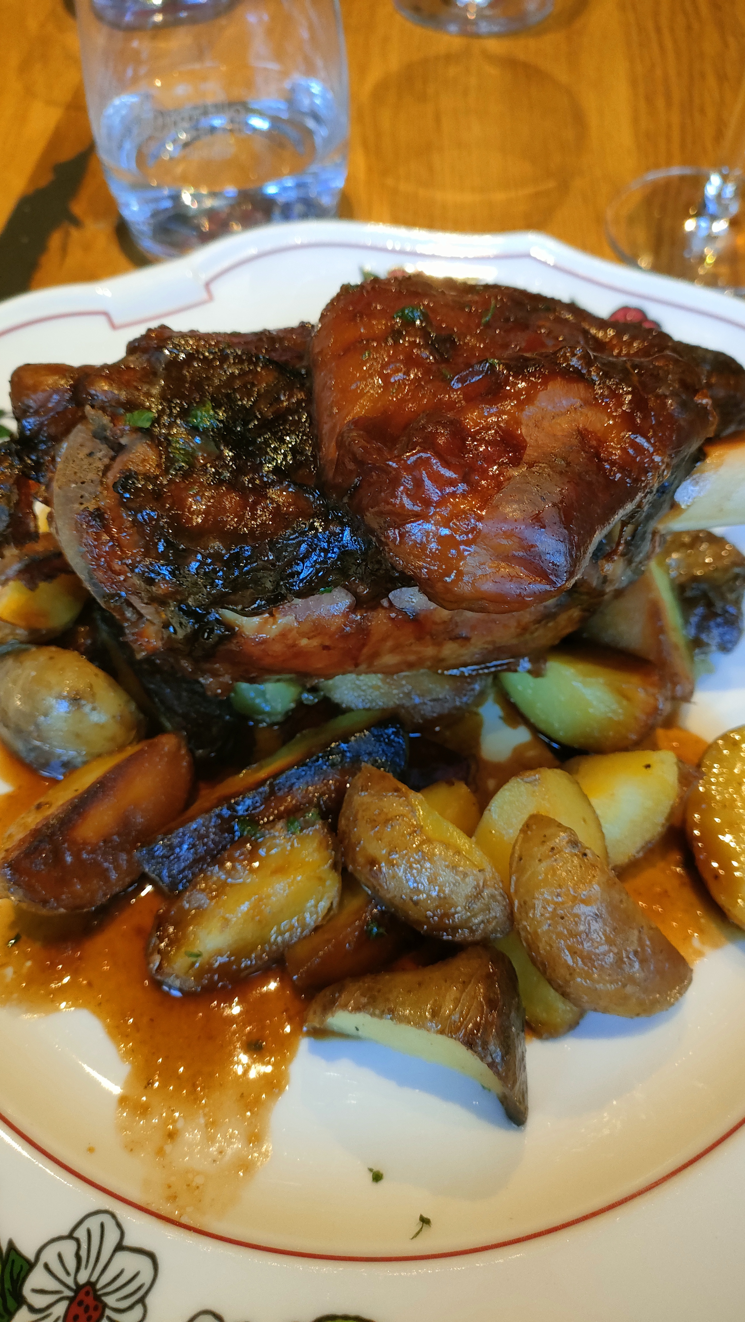 Une jolie table et des plats copieusement servis 👍🏼 Le jarret de porc rôti est délicieux 😋 De la salade verte et des légumes sont servis avec les plats.