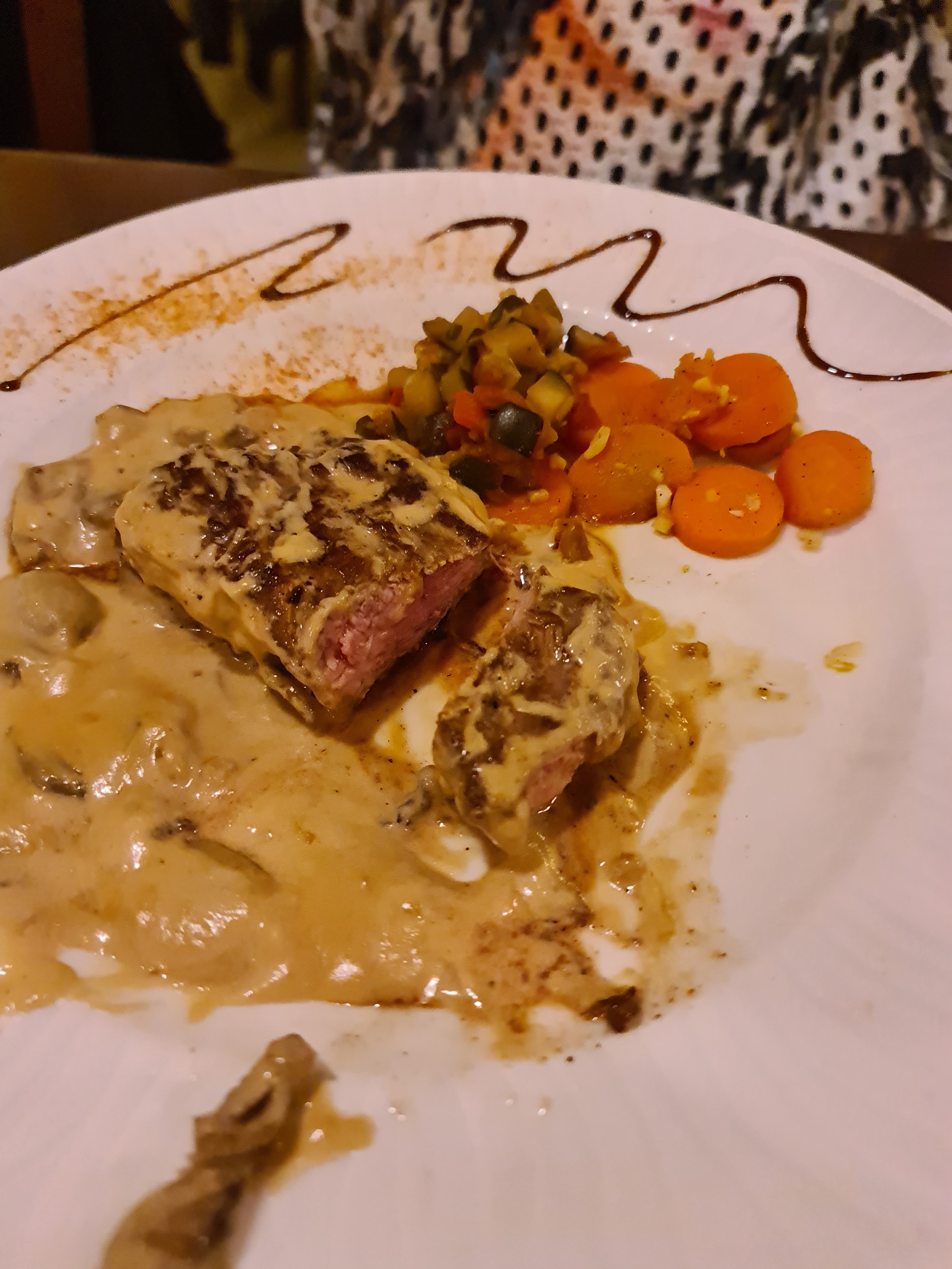 Repas variés et belle présentation dans l'assiette..j'ai pris une escalope de veau aux champignons qui était relativement tendre et la sauce onctueuse..choix de plusieurs accompagnements possibles.. Le cadre et toujours aussi rustique et mignon avec une magnifique cheminée..