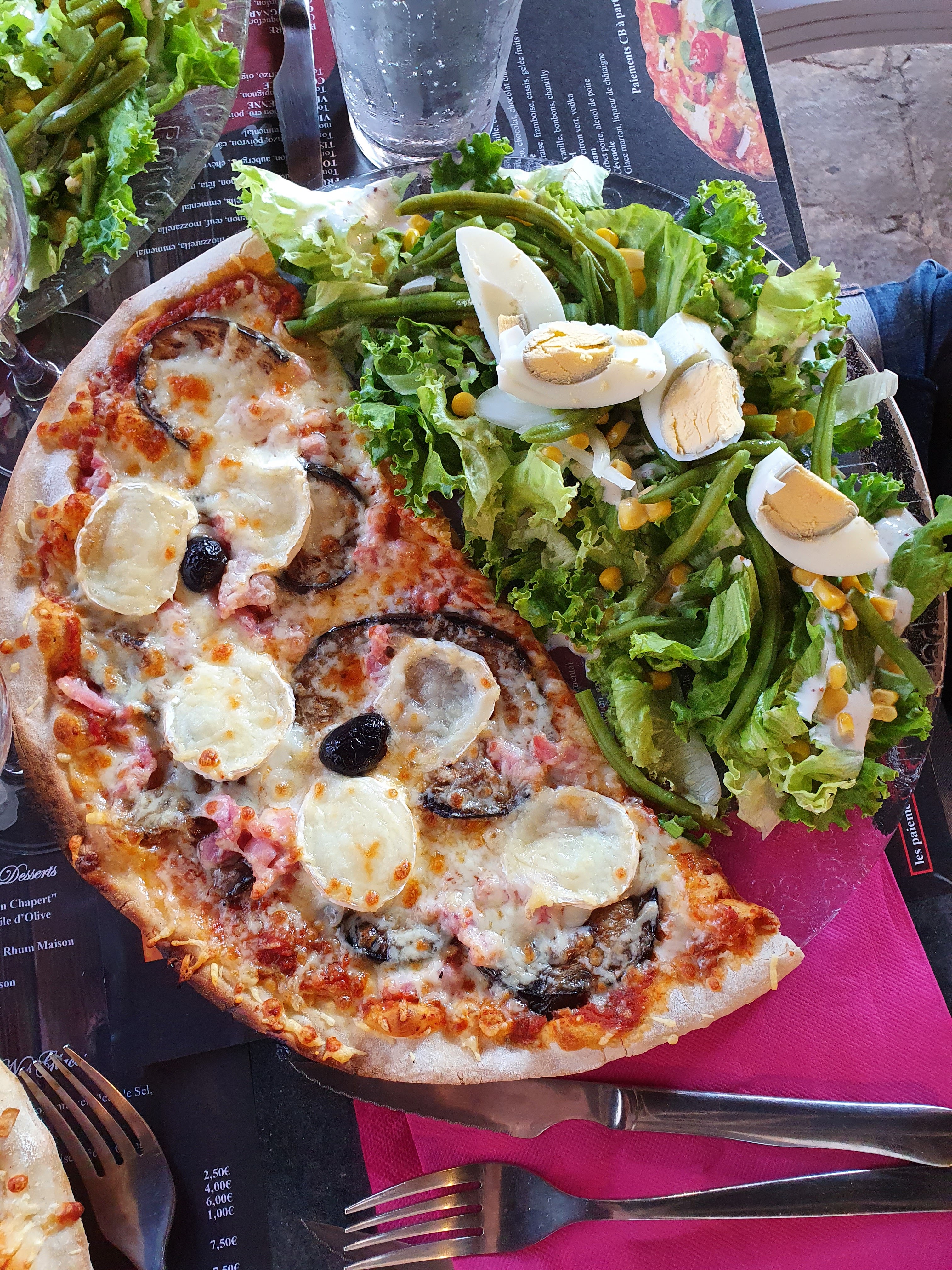 Pour un déjeuner du style snacking ++ en itinérance ou bien parce qu'on se posera et on prendra plus de temps ce soir avec une formule 1/2 pizza salade pour 13€. Tout cela servi rapidement avec le sourire dans une ambiance familiale. Et on est dans les remparts d'Aigues Mortes. Et oui ! Bravo et merci de proposer aussi des plats plus élaborés pour ceux qui veulent se poser midi et soir.