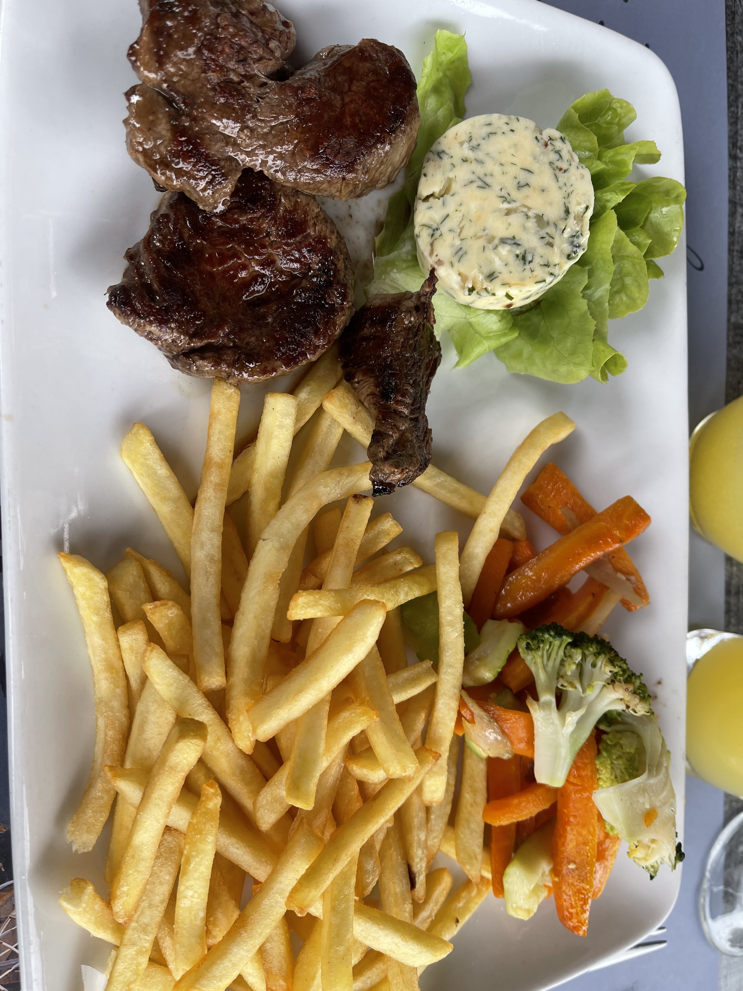Steak frites très médiocre (qualité de cantine collégiens). Glace en cornet industriels casino. Resto très belle déco malgrès le service assez crispé.