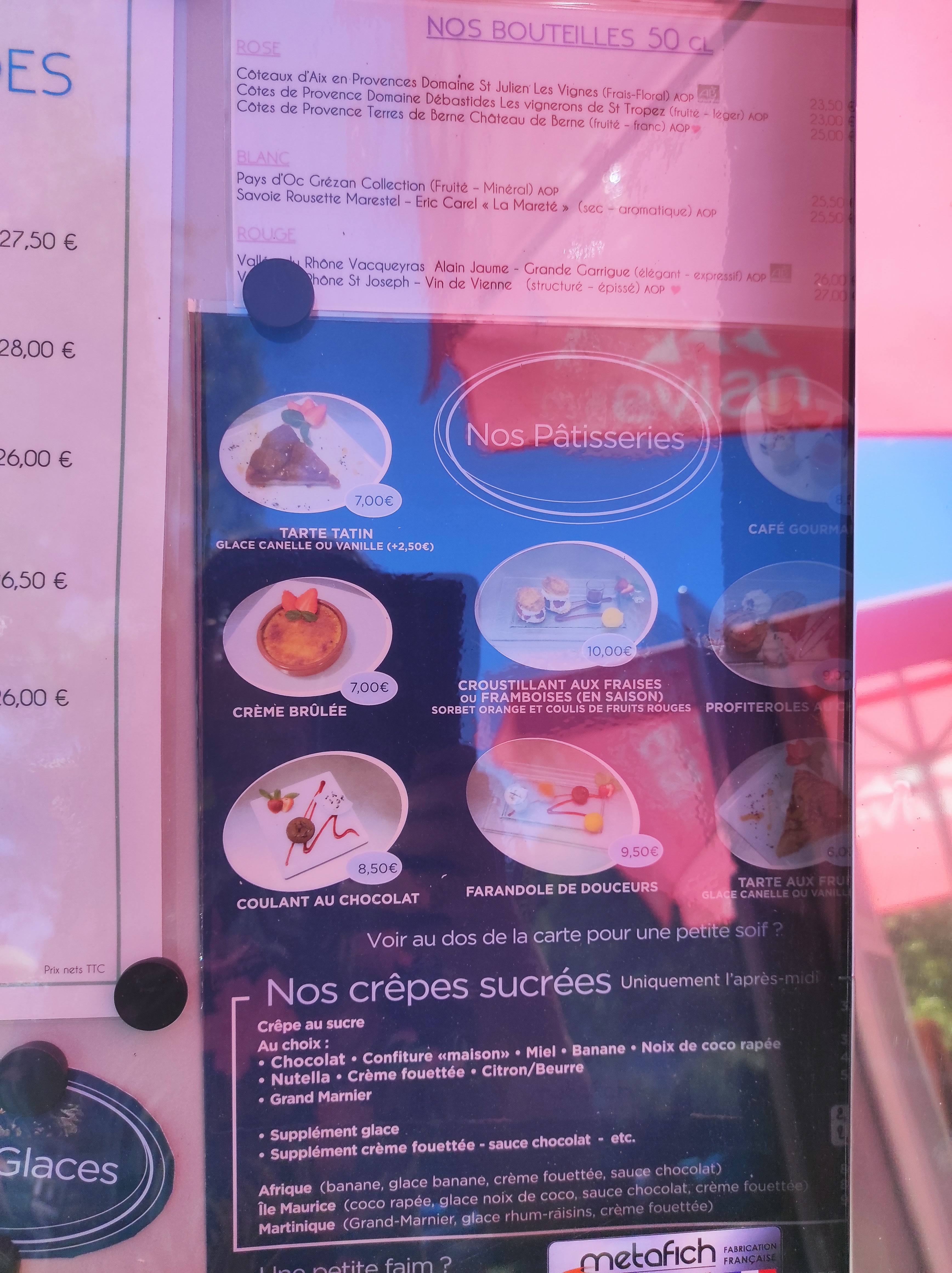 11 euros pour un melon jambon... Vous payez clairement le cadre. Personnel agréable, mais la cuisine ne vaut pas le détour. Au dessert bois commandons une crêpe qui est sur la carte. A la commande on apprend qu'ils ne font pas.les crêpes. On nous apporte la note en fin de service nous pressant de payer l'addition alors même que le café n'a pas encore été servi, bref ce n'est pas un lieu mémorable de cette jolie ville d'Évian ...