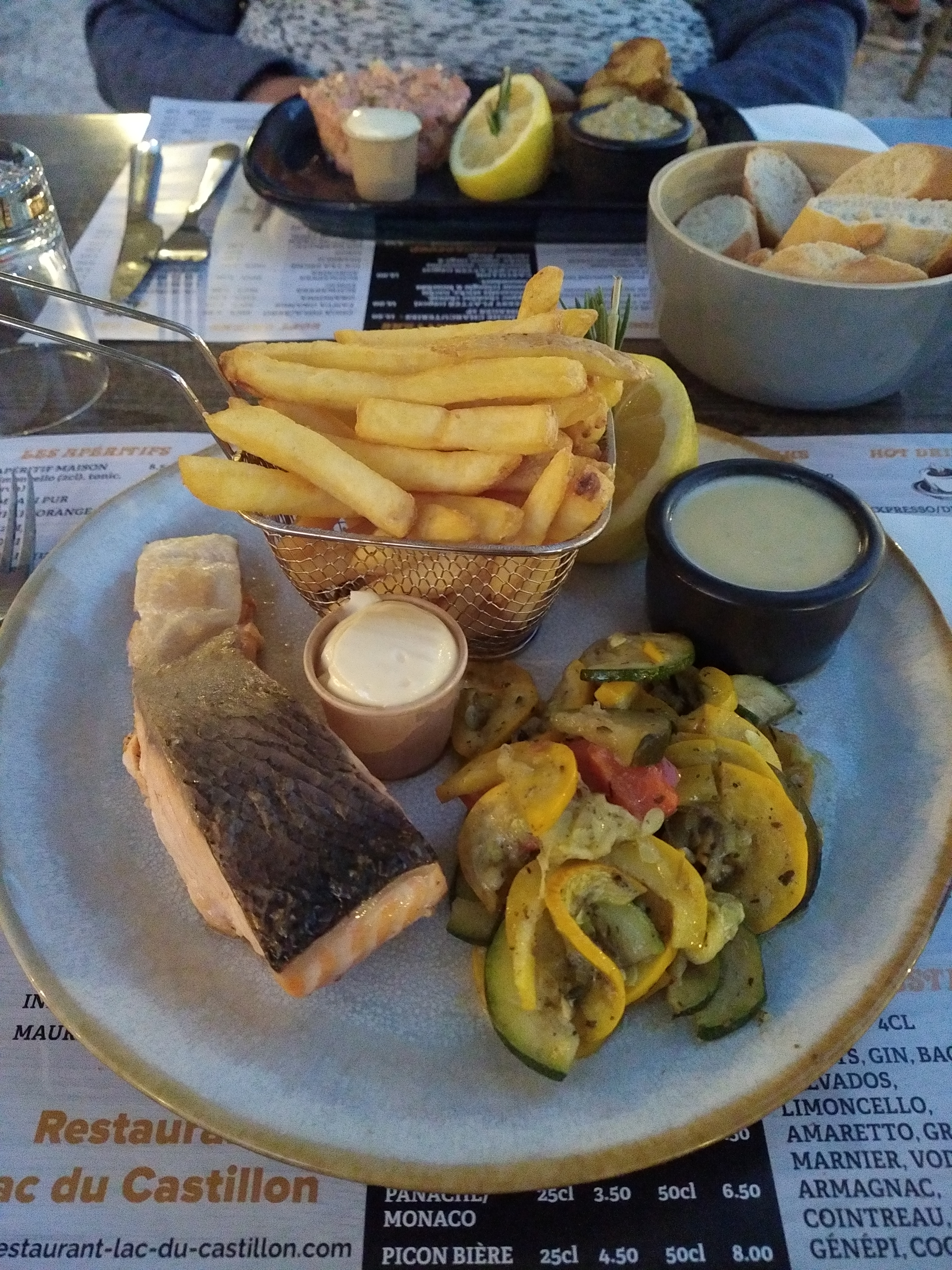 L'endroit ne paye pas de mine, mais décoration chaude et sympathique à l'intérieur. Notre serveur était très sympathique et professionnel. J'ai pris le Burger au saumon, agréable surprise, plat bon et copieux. Je vous conseille le coulant au chocolat, mes deux filles en parlent encore!!! Lors de mes prochaines vacances dans les gorges du Verdon, je reviendrai au restaurant du Lac de Castillon:)
