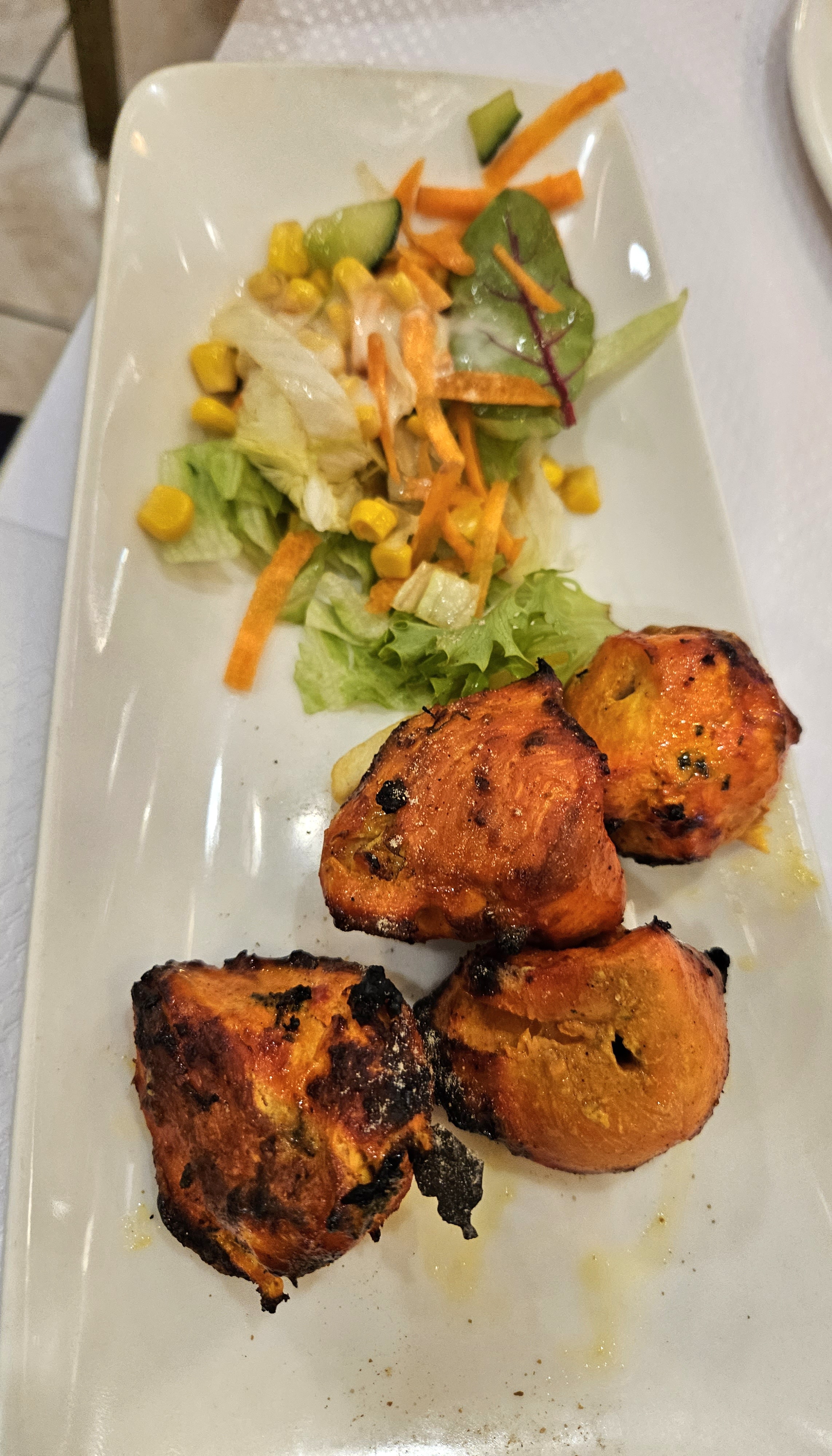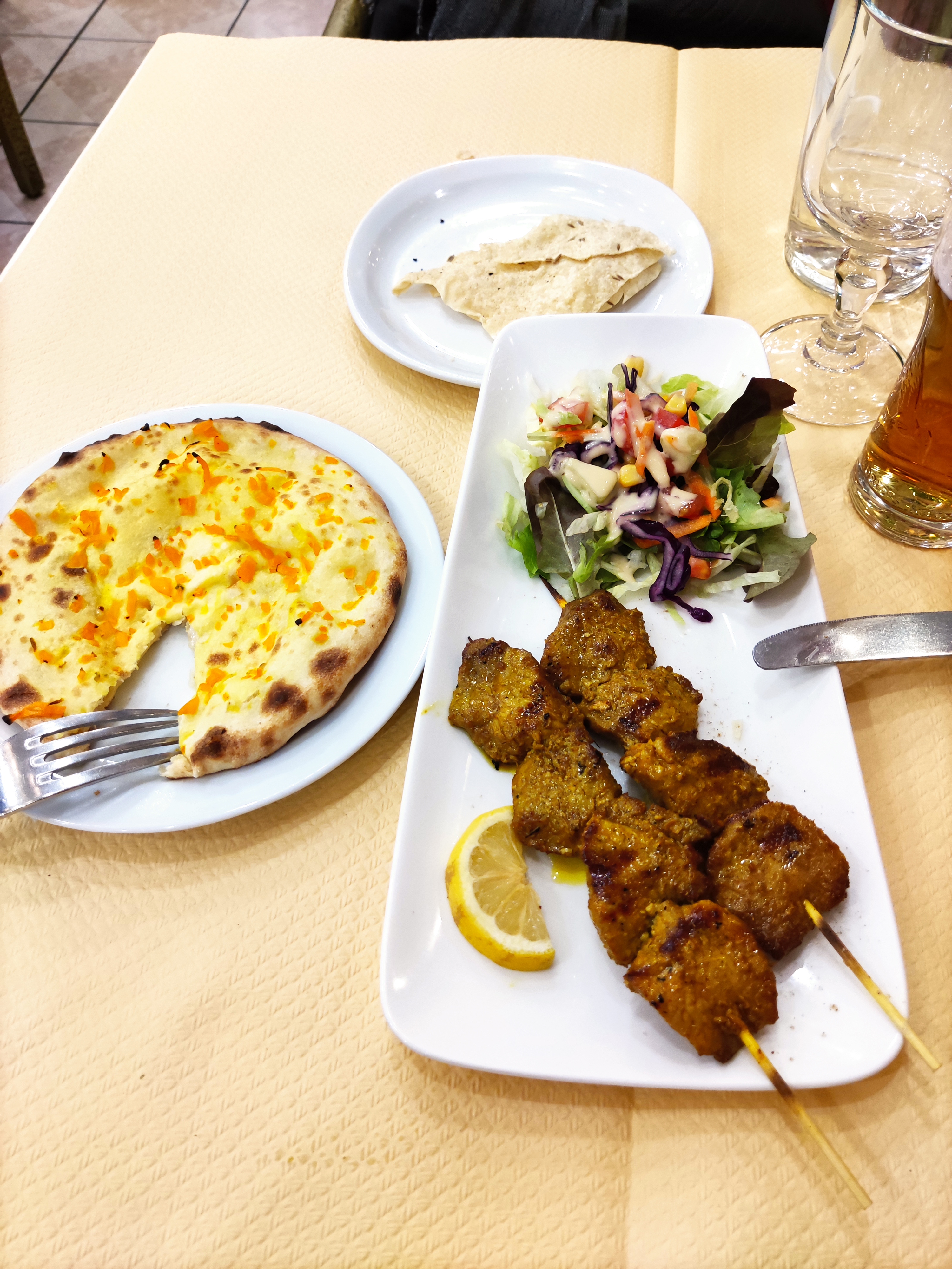 Ce soir c'est cuisine indienne : nan fromage oignons et brochettes agneau Grill puis poulet tikka massala avec riz safran. C'était excellent ! Serveurs très très agréables, service et conseils. Pour finir, même si ce n'est pas Indien, tarte tatin avec sa boule vanille, très bonne.