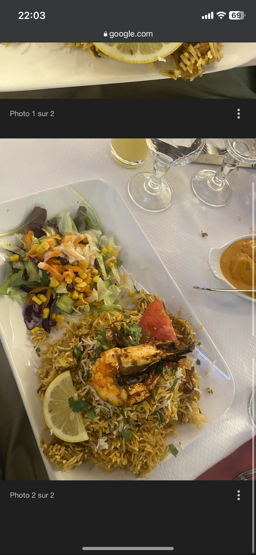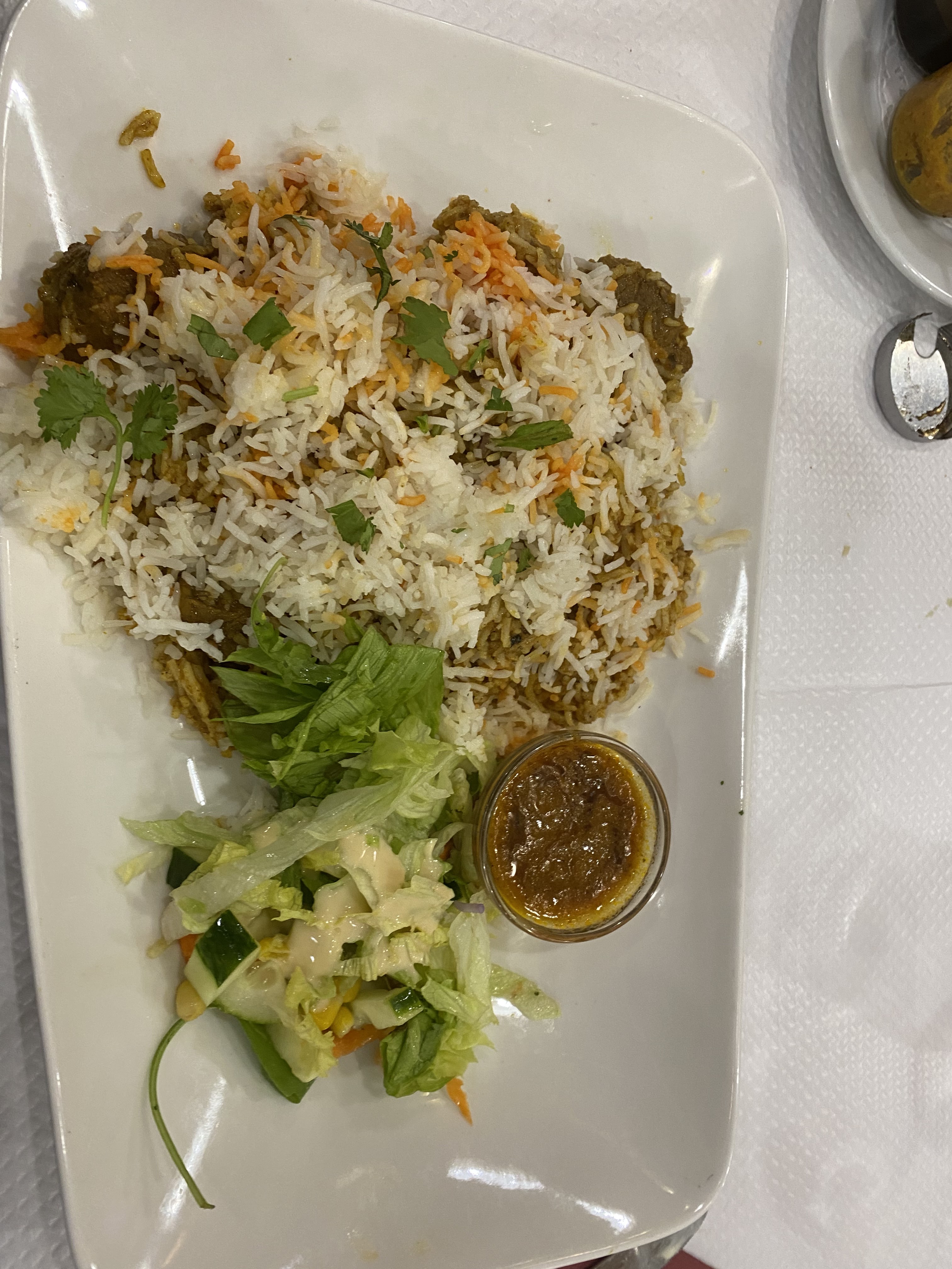 Beau restaurant, belle déco. Mais au niveau rapport qualité/prix il y aura un petit soucis. Le Maharaja Biriyani à 20,90€, est beau visuellement ( sauf pour la salade je ne sais pas ce qu’elle fait sur l’assiette), mais au niveau du goût on y est pas trop, pour le prix il n’y a vraiment pas de goût et pas non plus la quantité nécessaire … c’est dommage. Le riz n’a aucun goût tout comme le mélange de viande qui n’a pas pris le goût du biriyani ( gambas, agneau, poulet et crevette). L’entrée poulet tikka et le lassi mangue étaient quant à eux excellent.