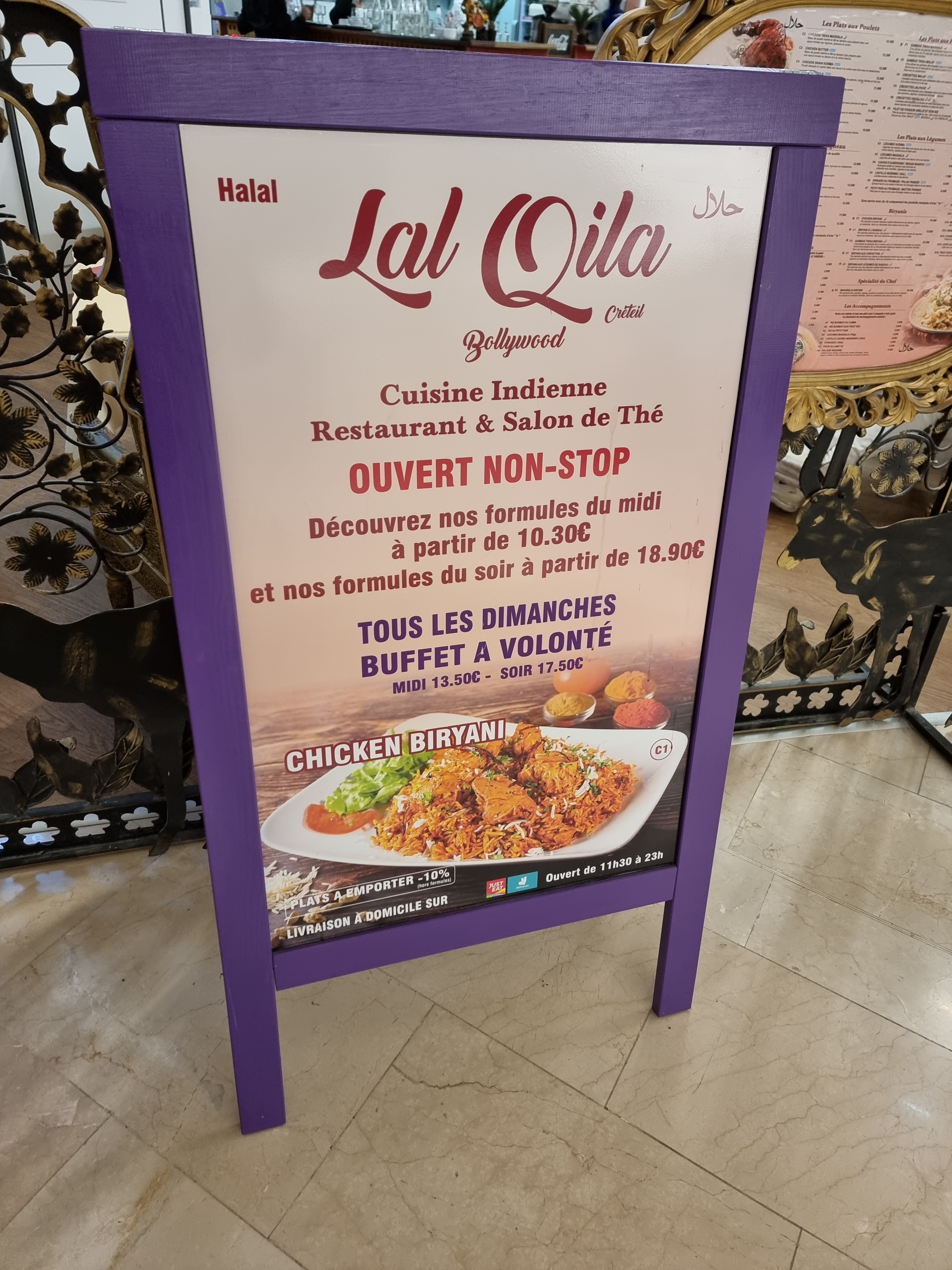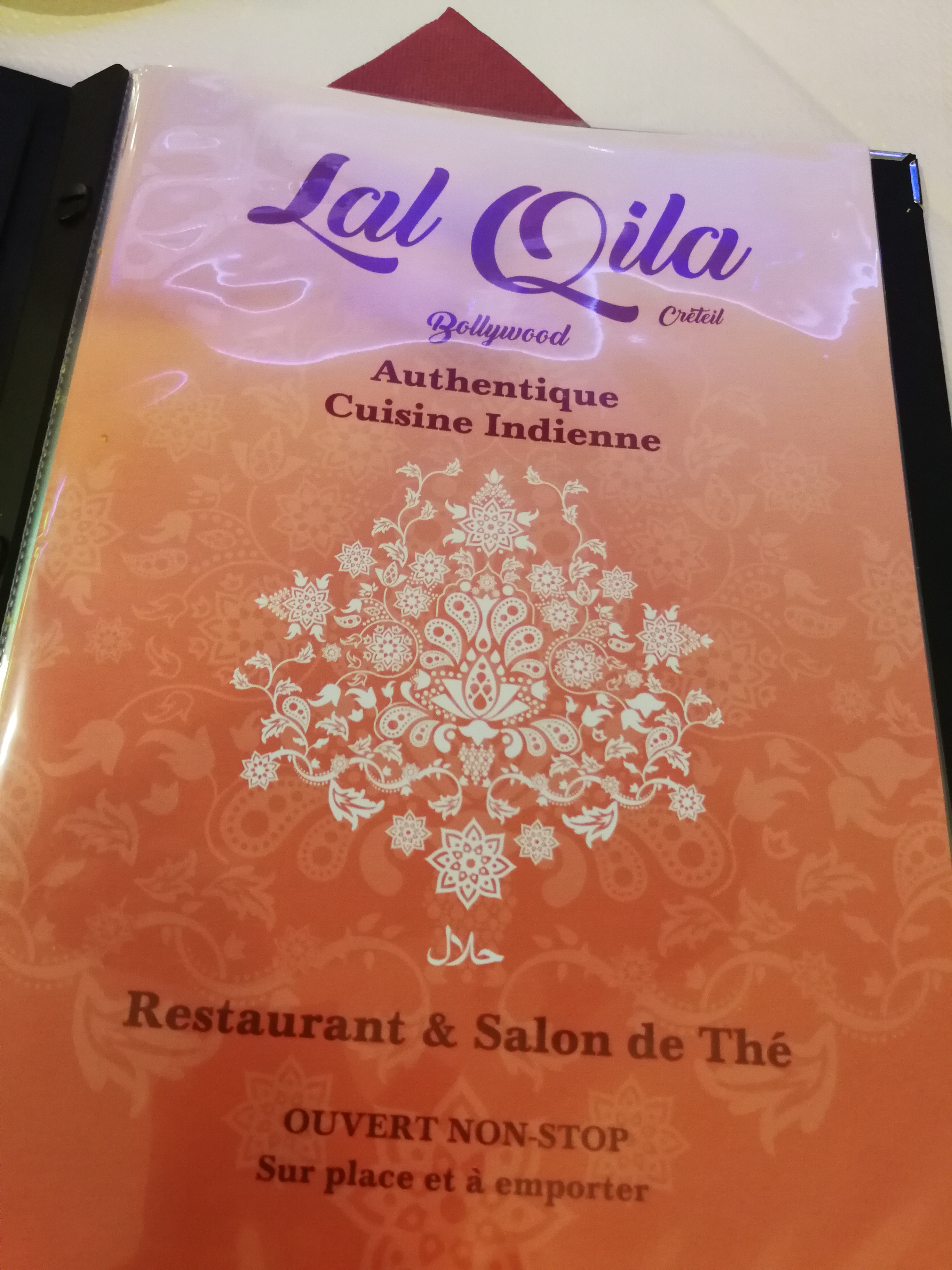 Arrêt à Lal Qila, restaurant qui attire l’oeil pour sa décoration avec une réplique du Palais Taj Mahal, allez on s’arrête là et on va voir ce que mon palais va répliquer 😃 Accueil un peu long, une fois la table proposée les cartes ne tardent pas à arrivée. D’ailleurs il n’y a que la carte parce que la prise de commande est trop longue, on s’occupe d’une table à ma droite parfaitement j’ai l’impression que ce sont des personnes qui sont liées au restaurant et que du coup je vais devoir me morfondre 🧐. Au moment où je me retourne pour interpeller un serveur celui-ci arrive et prends ma commande 😅 pas trop tôt… Je vais prendre un menu du soir à 18,90€ 1 plat+ riz+ un nan + une boisson, je choisis « Agneau Vindaloo, un Nan au fromage, du riz et un coca zéro » Verdict: Un petit encas de galette de pois chiches avec différentes sauces vont sont déposées, sauce au yaourt et herbes, sauce sucrée et une sauce piquante avec différents épices. L’agneau Vidaloo: C’est sympa , c’est épicé mais je ne suis pas certain que ce soit cuisiné maison, je trouve une pomme de terre mais aucun légume type tomate, poivrons ou autres, la viande est très cuite et ne ressemble pas à une cuisine faite maison, c’est bon mais j’ai l’impression de manger toujours les mêmes plats dans ces restaurants indiens / pakistanais et sans jamais être surpri et surtout j’ai été impression d’etre à la cantine.Ça me fait penser à ces restaurants traiteurs chinois qui proposent des raviolis / n’émis et autres plats industriels. Le riz: Idem, c’est sans plus aucun épice présent, insipide c’est dommage j’attendais plus… Le Nane au fromage: Ça permet de finir un repas comme celui là en ayant rempli l’estomac mais pareille que les autres commentaires, rien qui me fasse vibrer le palais,p. Note 2/5 Deux points pour la décoration le reste est à revoir. ®️