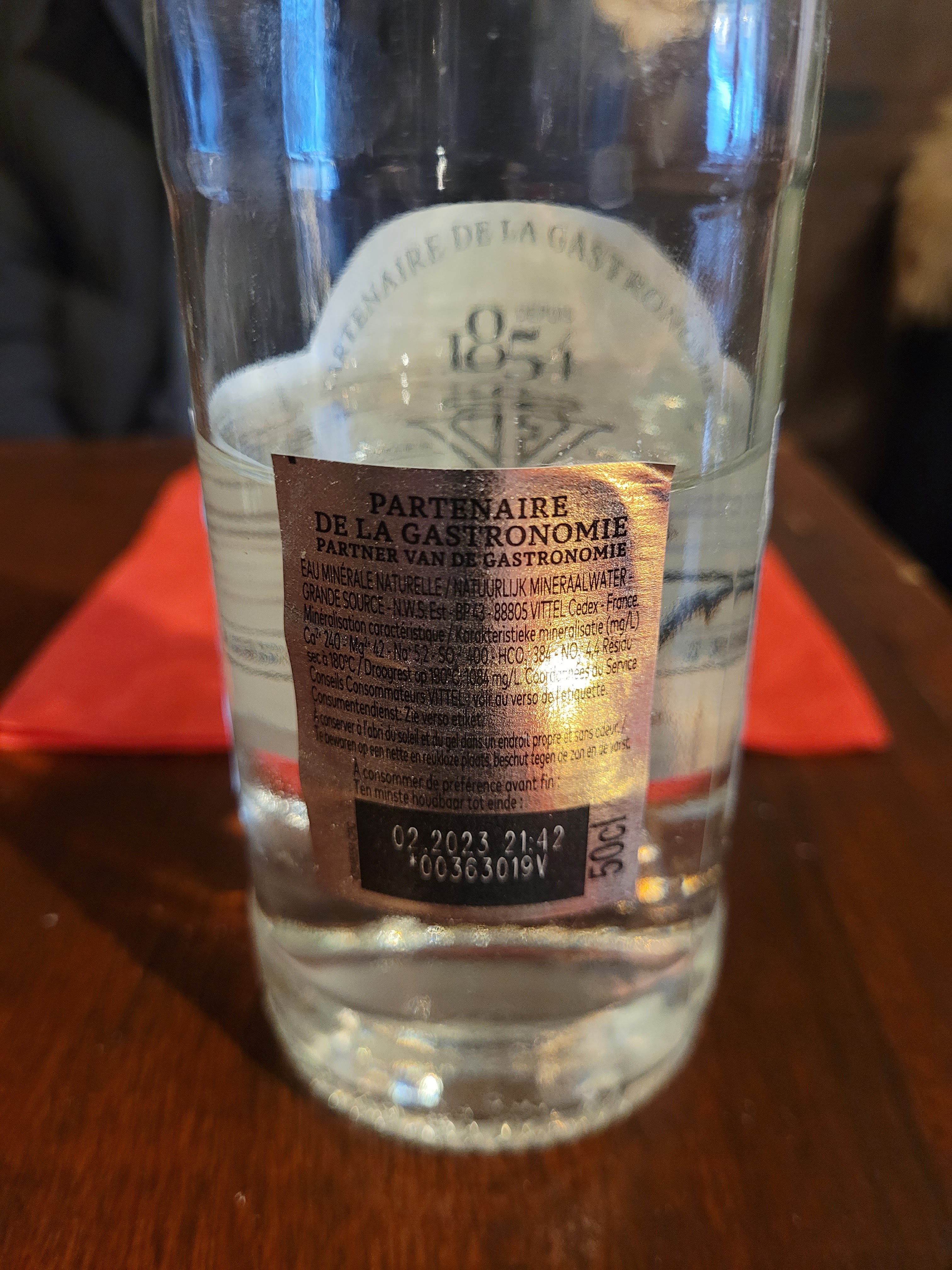 Un détail apparemment petit qui en dit long sur ce restaurant : ils nous ont fait payer de l'eau en bouteille mais nous ont servi soit de l'eau du robinet, soit de l'eau en bouteille périmée. Notez la date de péremption de février 2023 sur la bouteille Vitel qu'ils nous ont servie en janvier 2024. Donc, soit l'eau était périmée, soit, plus probablement, ils ont versé de l'eau du robinet dans une vieille bouteille Vitel pour pouvoir nous facturer de l'eau en bouteille sans avoir à le faire. acheter eux-mêmes l'eau en bouteille. Cela nous a donné une impression négative et nous a amenés à nous demander de quelles autres manières ils faisaient des économies pour gagner plus d’argent.