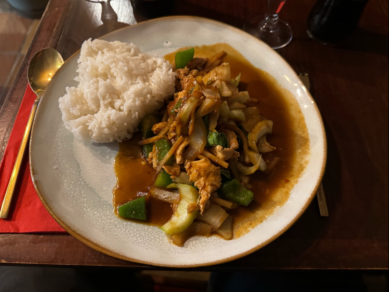 Excellent curry vert de poulet. Ambiance chill et calme. Merci !