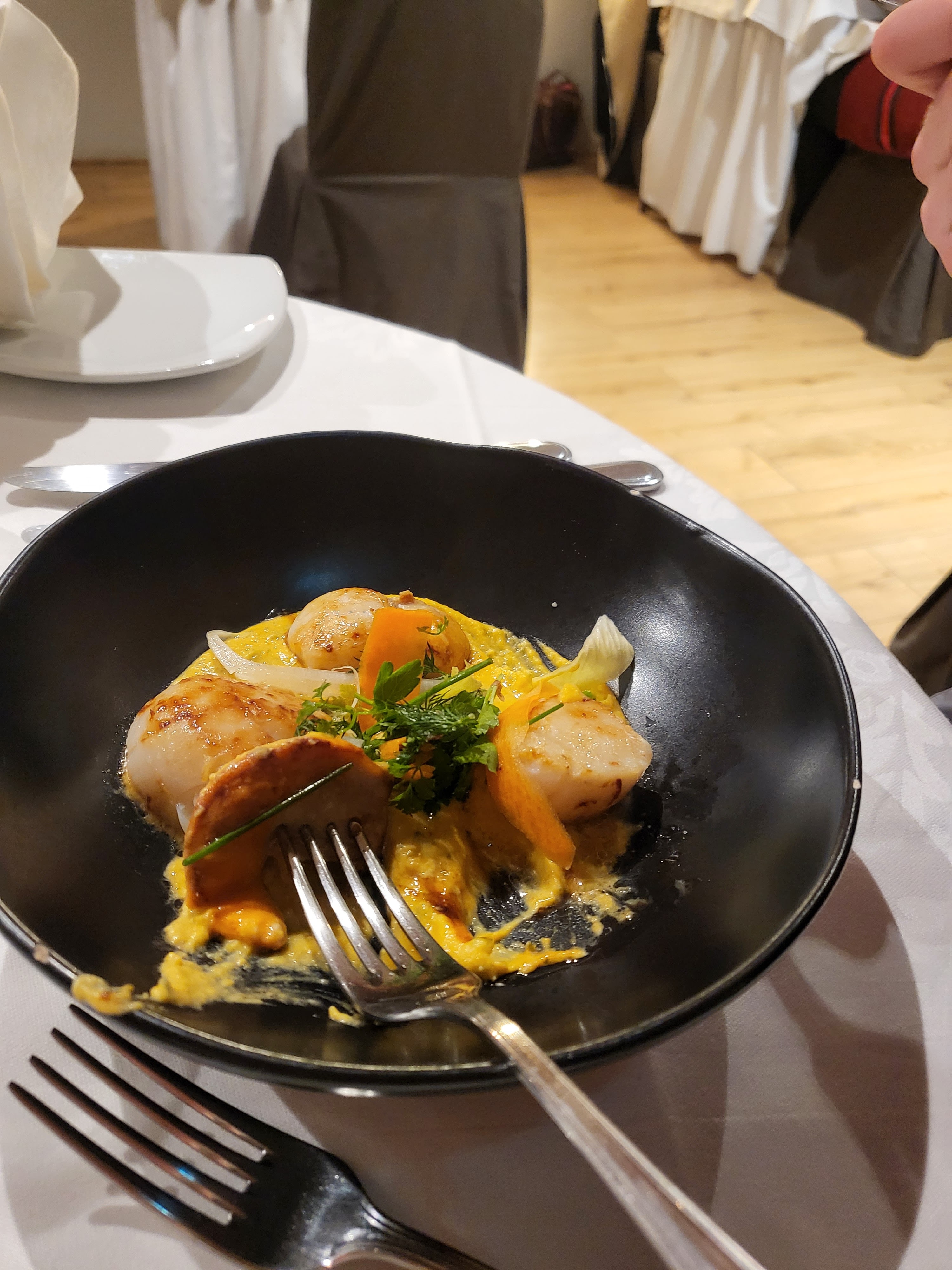 Nous repartons malheureusement bien déçus. Un restaurant qui se prétend gastronomique, mais qui est loin de l’être. Nous sommes accueillis dans une salle peu éclairée, avec des fleurs en plastique sur la table. L’apéritif arrive sans être expliqué par le serveur, l’entrée est plus que décevante : une crème brûlée à la betterave insipide qui n’a pas le goût de betterave. Monsieur a pris la raviole de crevette avec du hareng fumé (et 3 arêtes en prime).Les quantités sont minimes, on finit l’entrée déçus , mais on laisse une chance au plat principal. Magret de canard sauce aigre douce / orange : je n’ai pas senti l’assaisonnement . Monsieur a pris le poisson : trop cuit … Nous avons décidé d’arrêter et de ne pas tenter le dessert.