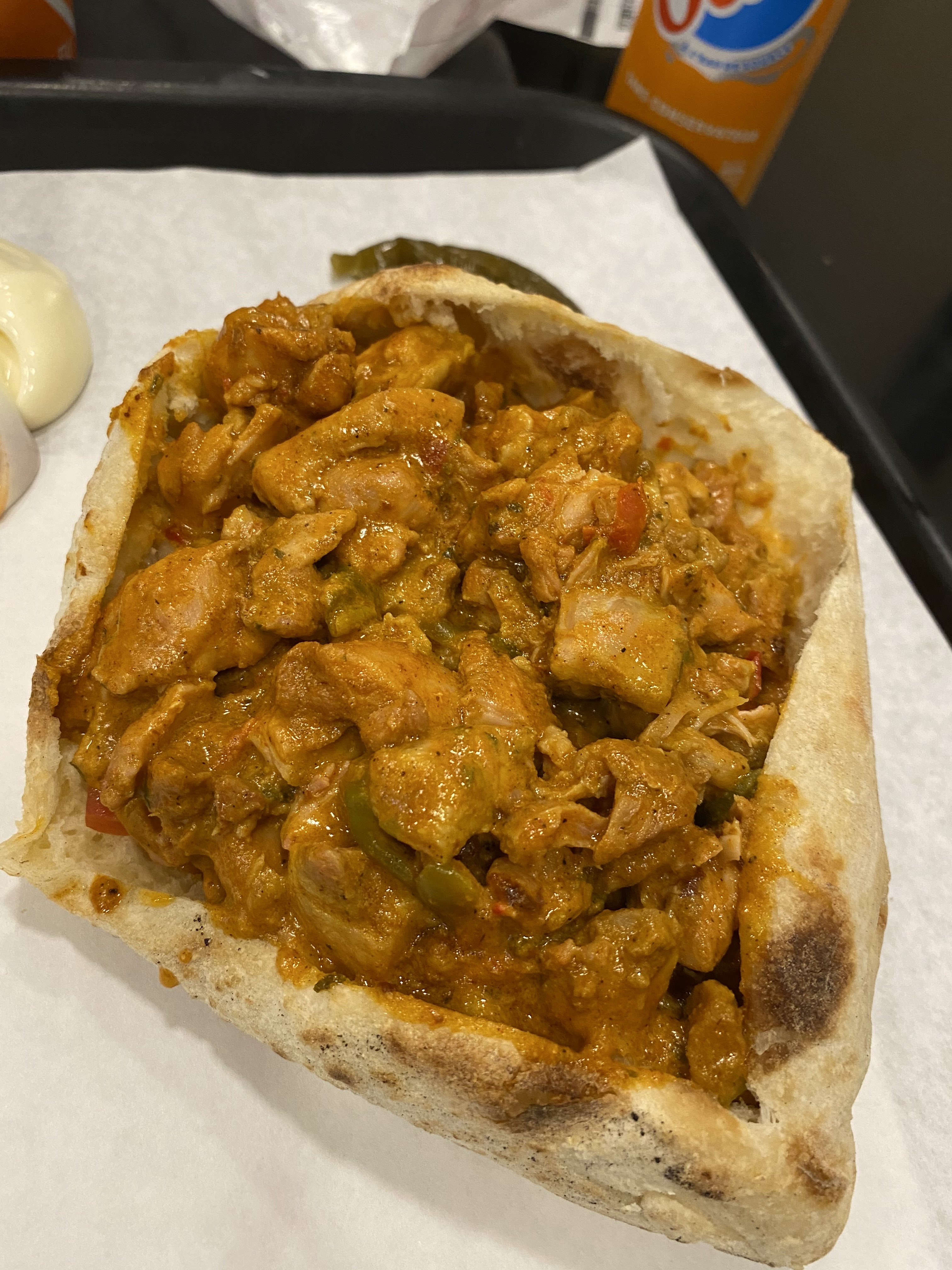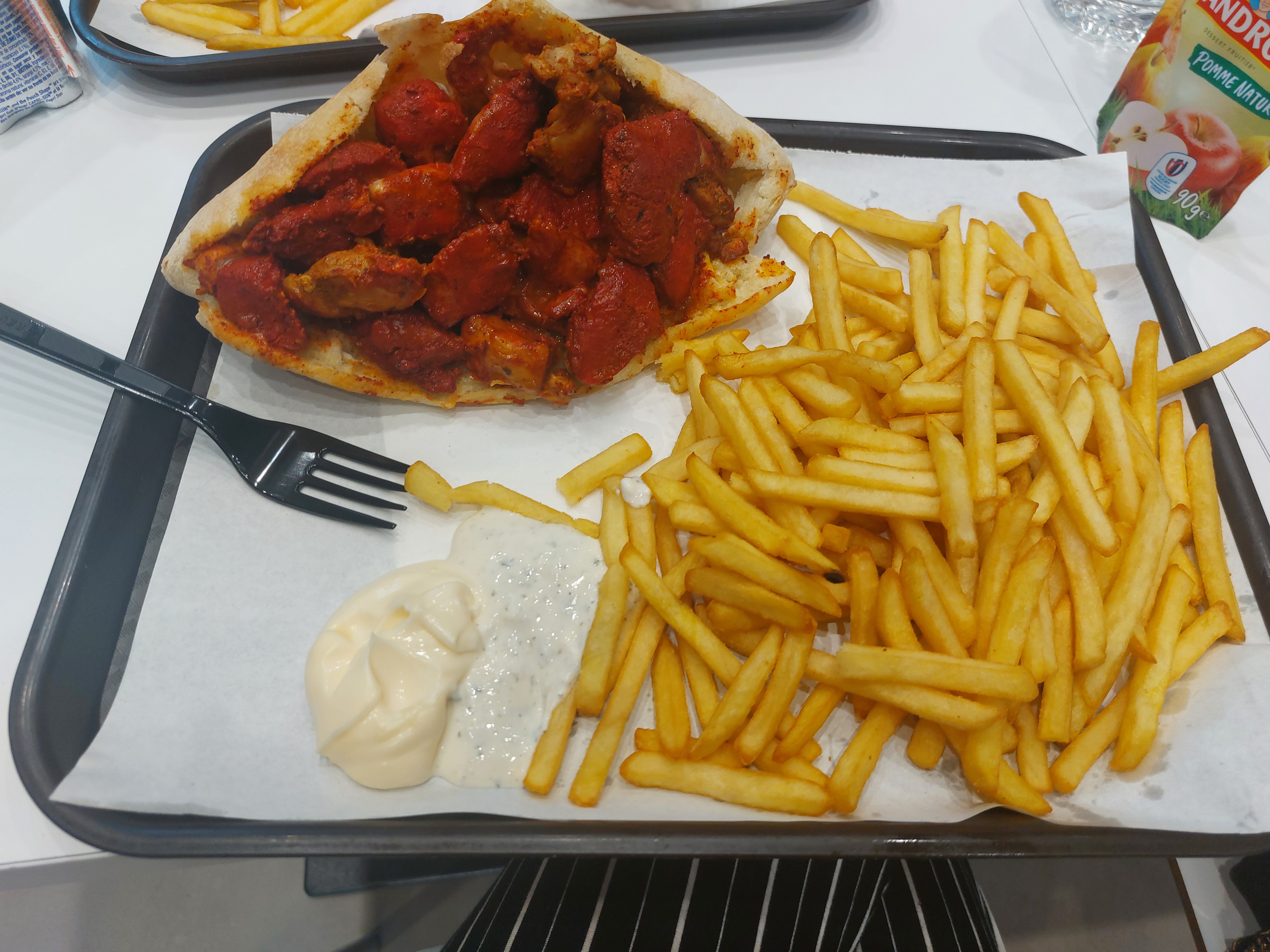 Un super petit fastfood!!! Un pain des légume et du poulet sauce tandoori extra, a faire tot ou tard sinon il y a beaucoup de monde. Mais ça va vite et ça vaut le coup!!? Et tout ça a 8,90€ le sandwich, la boisson et les frites. Le tout énorme!!