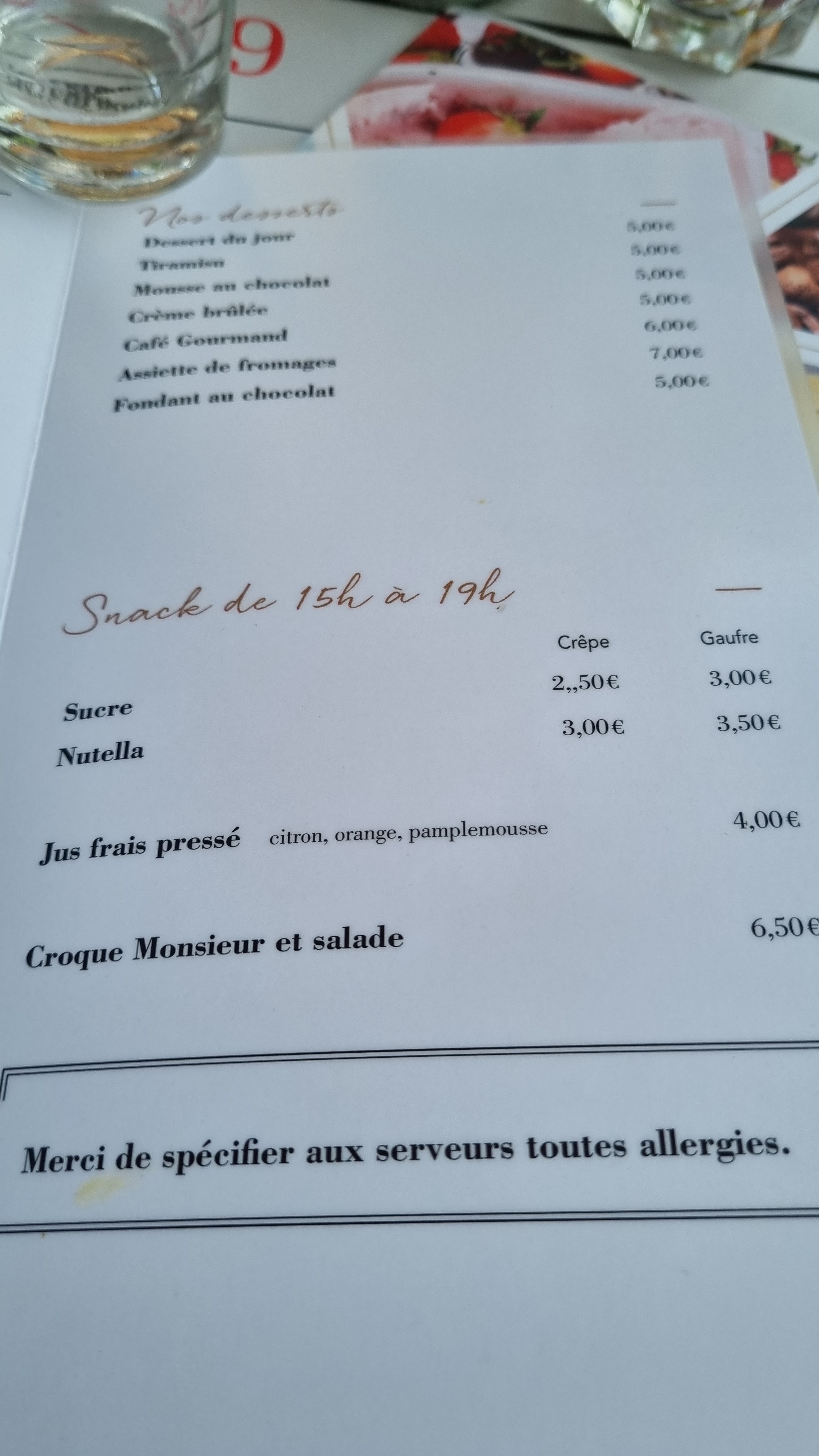 Hormis le tartare de bœuf avec lequel je me suis régalé, les salades et lasagnes de poisson étaient décevantes. Le prix et les plats ne sont indiqués que sur une ardoise présente devant le restaurant. Pour ce qui est des dessert rien à signaler si ce n'est un supplément Chantilly ridicule sur les boules de glace d'1€ déplorable...