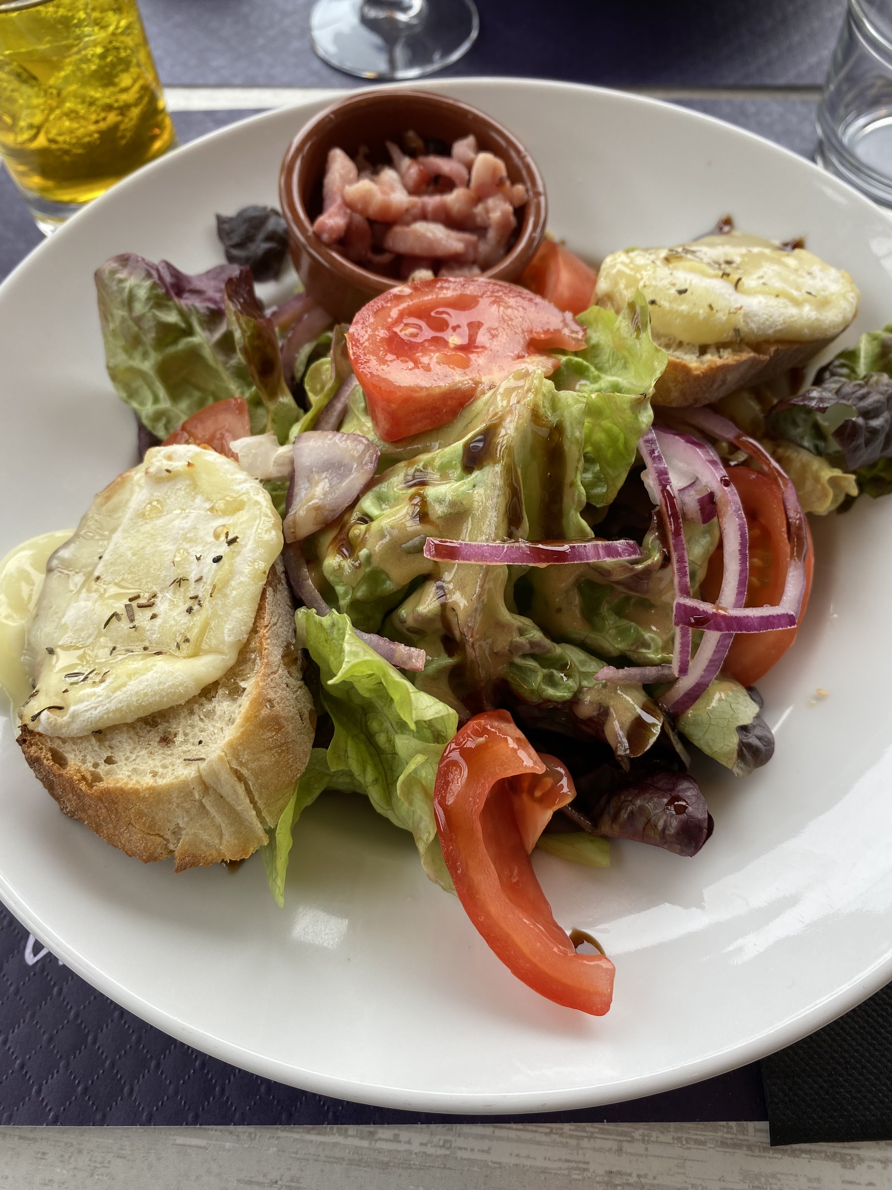 Déjeuner rapide après visite de l'aquarium Accueil agréable malgré une arrivée tardive Bons plats simples ...vraie salade et tomates au goût de tomate ☺️