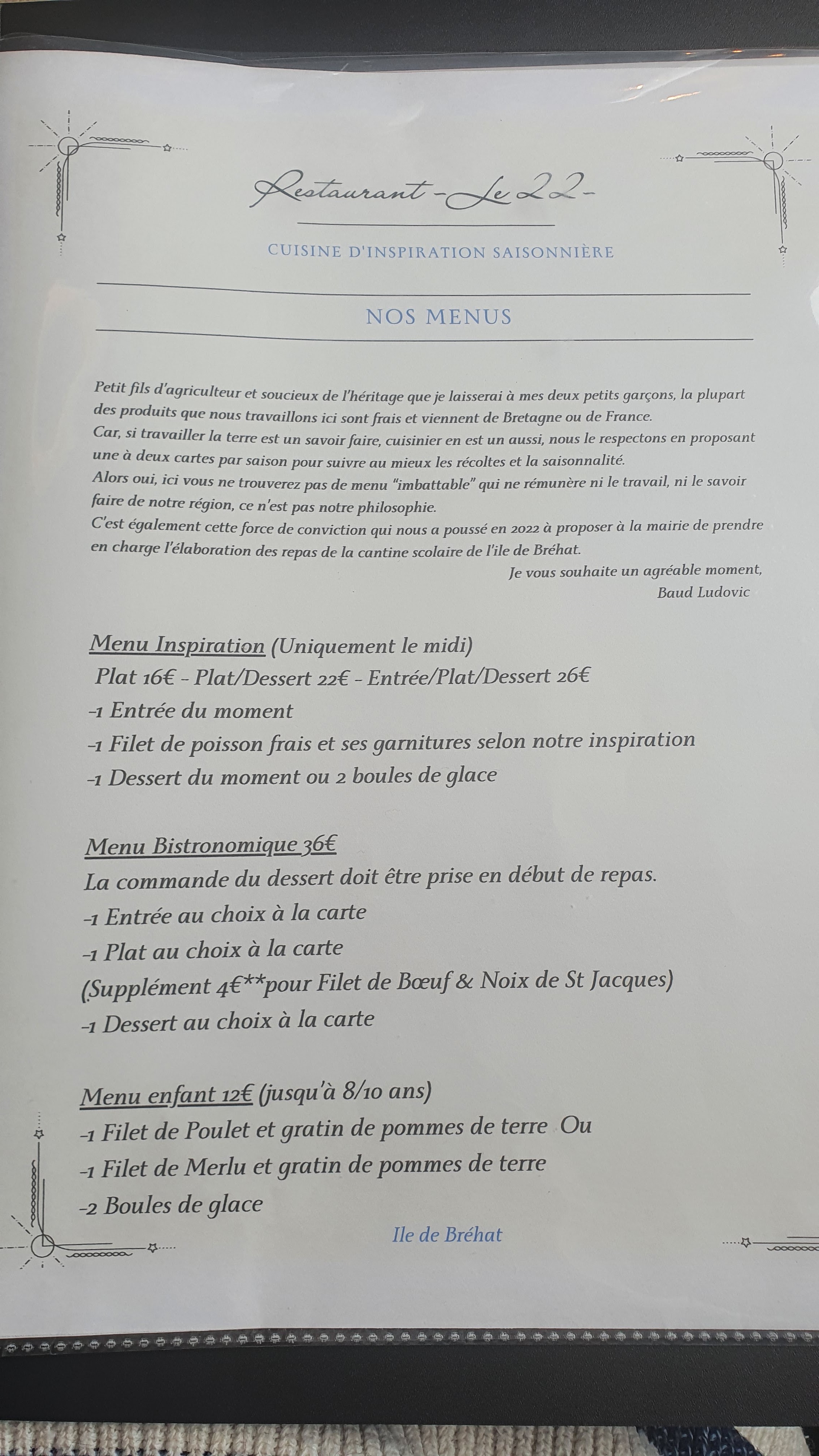 Toujours bien reçus au 22, une carte intéressante, une équipe charmante et des plats de saison de qualité qu'on ne s'attendrait pas forcément à trouver sur une petite île comme Bréhat. A recommander les yeux fermés !