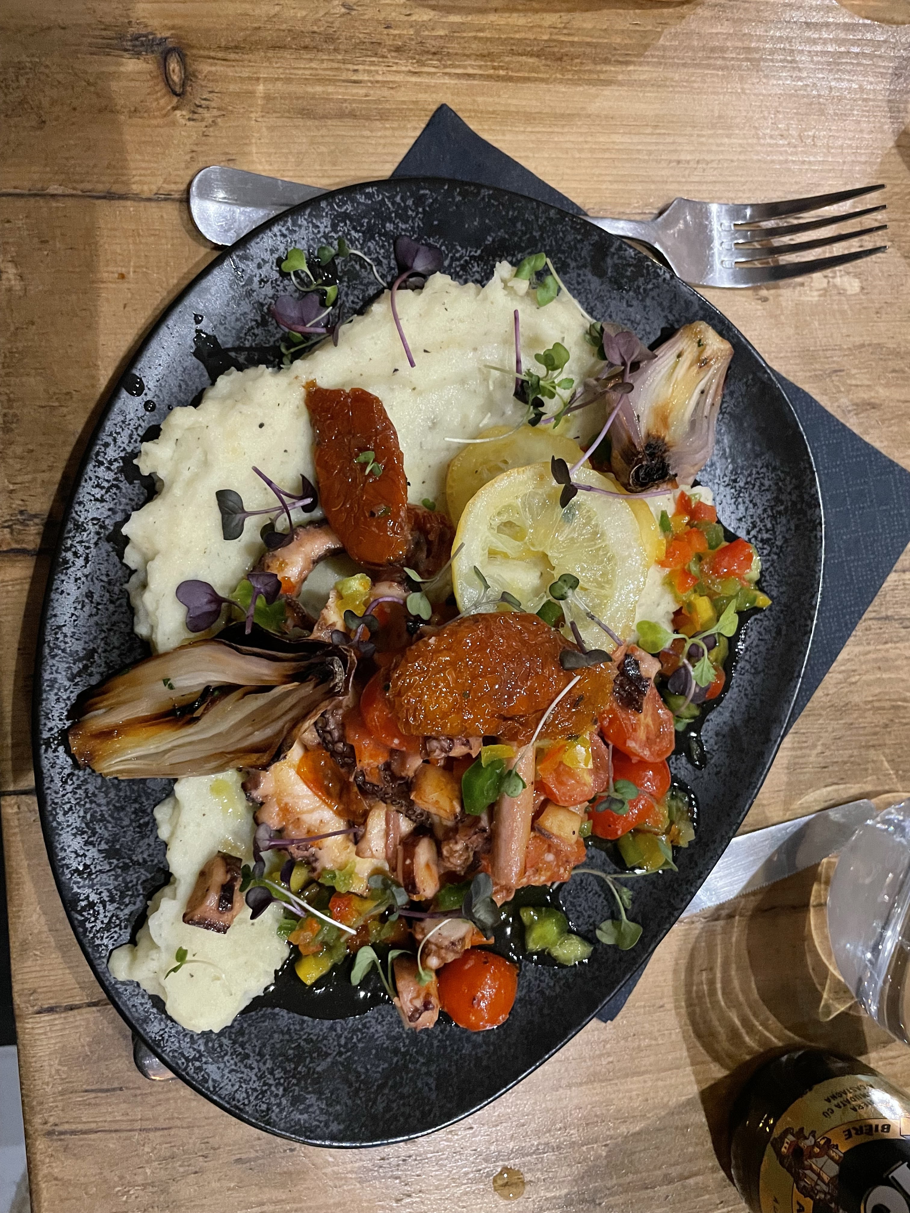 Le lieu est sympa, j’ai apprécié la décoration « jungle » de la terrasse. La serveuse était vraiment super gentille. Le poulpe est malheureusement caoutchouteux. Le second plat était un peu fade. On aurait aimé prendre un dessert mais il semblerait que la serveuse nous ait oublié. C’était un moment agréable mais je n’y retournerai pas forcément.