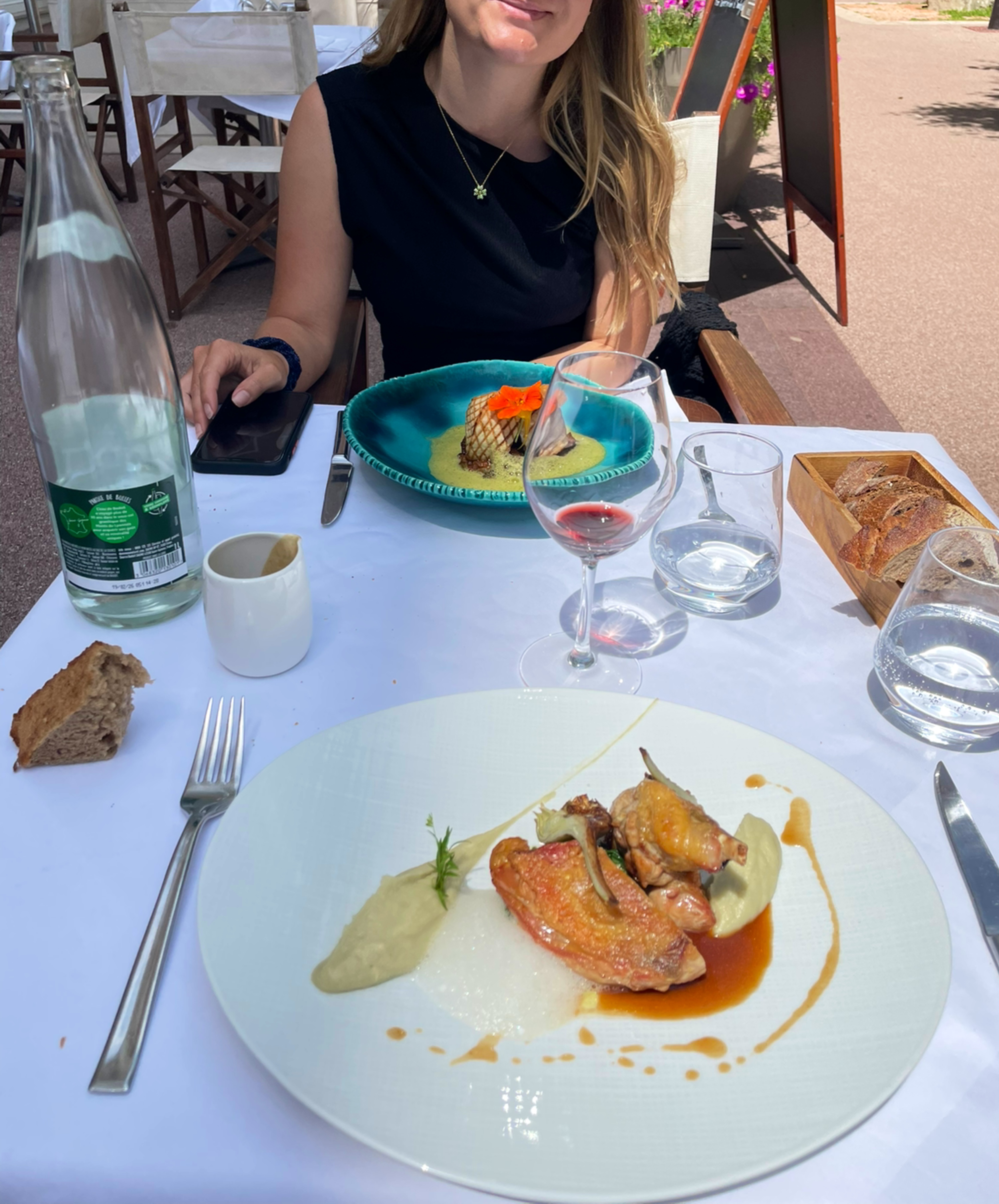 Nous avions une smartbox « Anniversaire gastronomique pour duo gourmet » à 99 € mais on a eu droit au menu « Déjeuner » avec entrée/plat/dessert à 35 euros … (avec deux coupes de champagne mais si on calcule bien ça fait 15 euros la coupe par personne… Sachant que je ne bois pas d’alcool donc j’ai pris un jus de pomme à la place!). La bouteille d’eau en supplément à 7euros … Non là on est clairement déçues !!