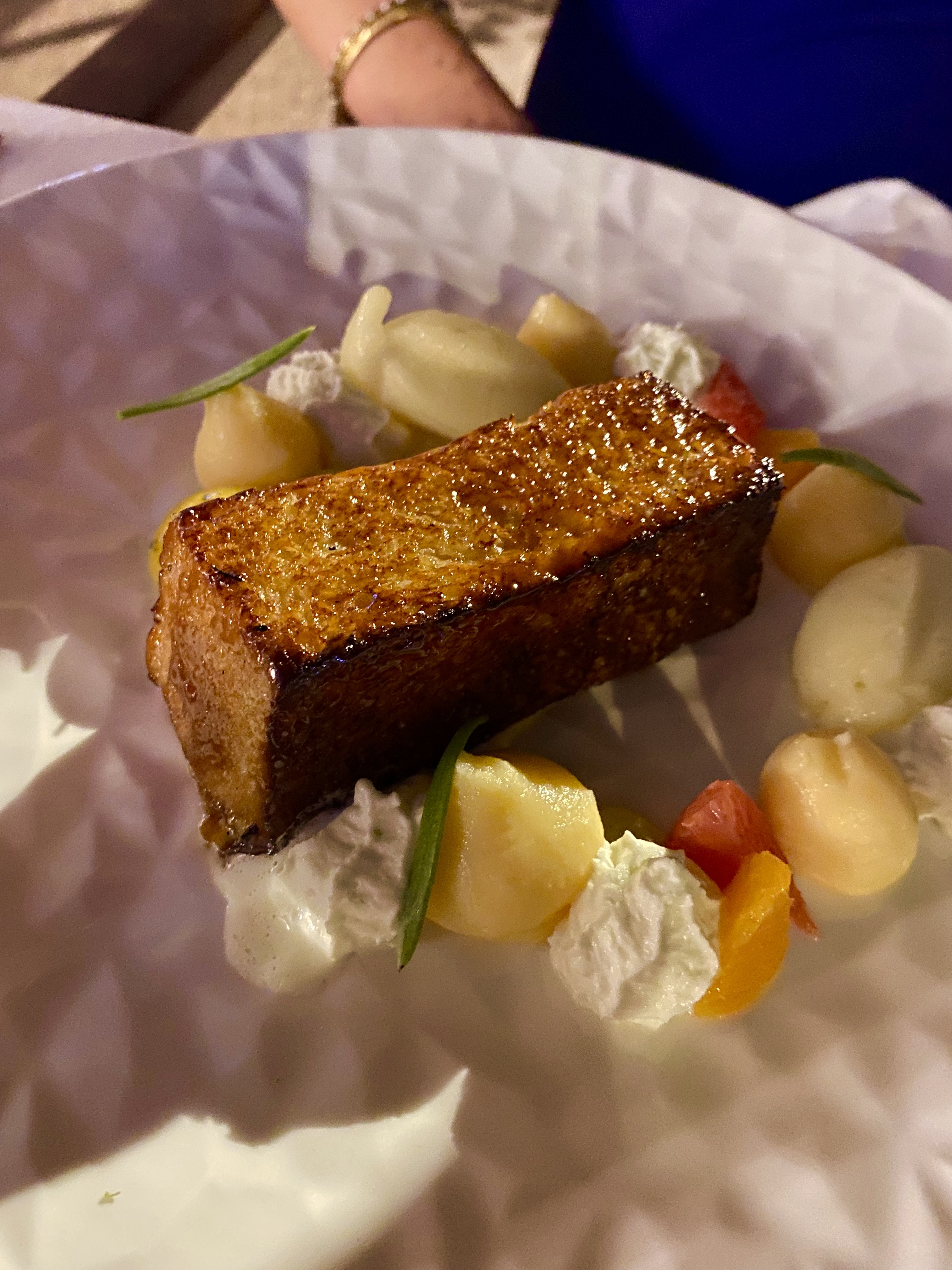 Une fois de plus, démonstration talentueuse de savoir-faire, de mise en valeur des produits, de créativité. En particulier, une sole d’exception avec une saveur harmonieuse de cacahuète et d’ananas ou encore en entrée, un maquereau brûlé à la flamme parfaitement maîtrisé… sans parler des autres plats dont le fameux et traditionnel ris de veau… Service prévenant et précis.