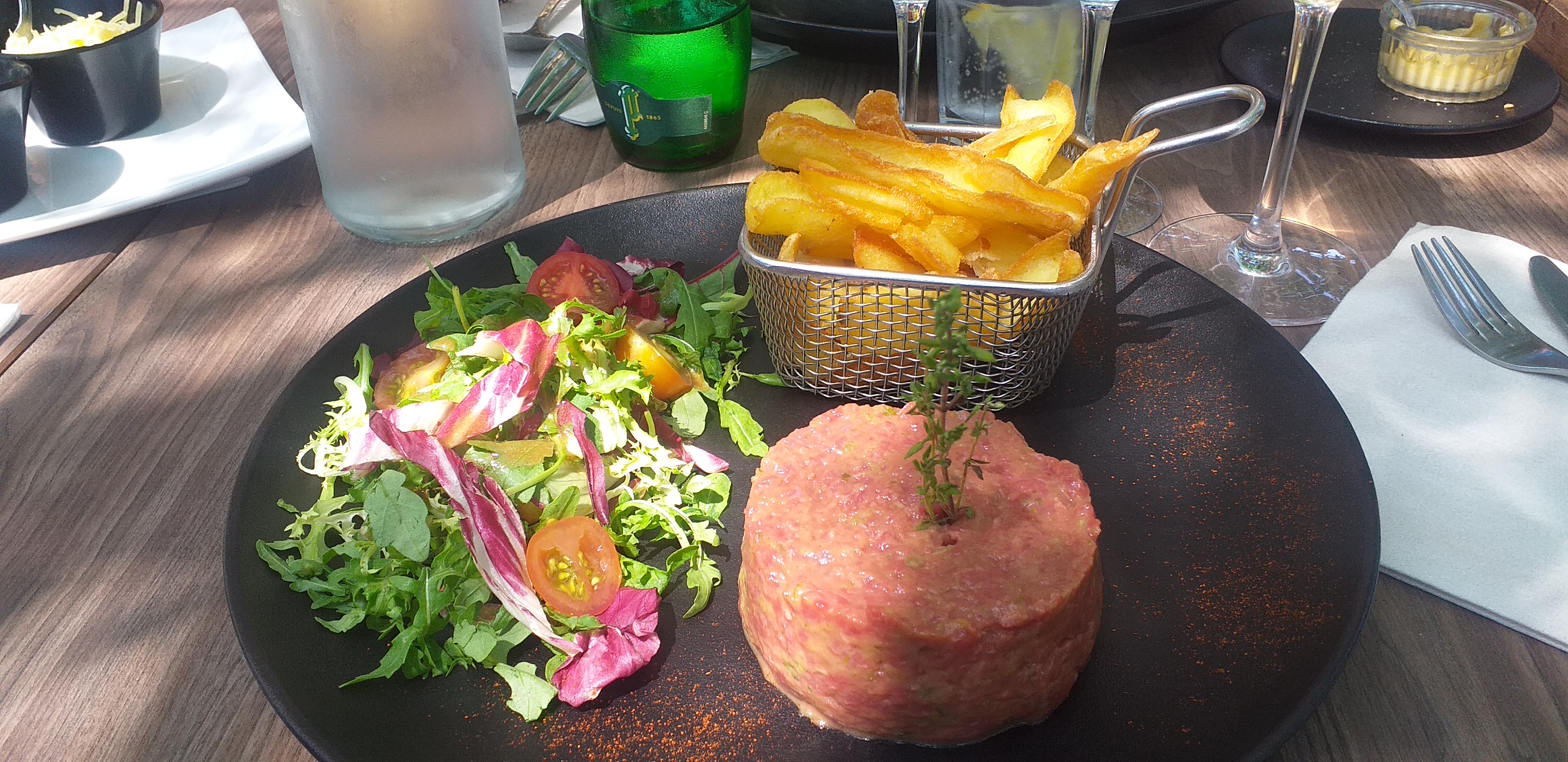 Comme un soufflet qui retombe . Bien dommage , car le cadre est joli , apaisant même, et le personnel très sympathique . Le problème est que les prix de la carte nous font espérer un peu de raffinement, un travail du chef , ou à minima quelque chose de bon . Nous avons pris 5 plats différents et avons tous constaté une qualité très industrielle dans nos assiettes , peu de goûts , et globalement des plats sans intérêts. Nous ne sommes pas dans top chef, mais avons tous été d’accord pour dire que les assiettes valaient largement 5 à 7€ de moins que ce qui est facturé . Quant au saumon gravlax .. normalement c’est différent d’un saumon fumé accompagné de crème fraiche Espérant que ce commentaire puisse vous aider à être plus en adéquation avec vos promesses 🙂