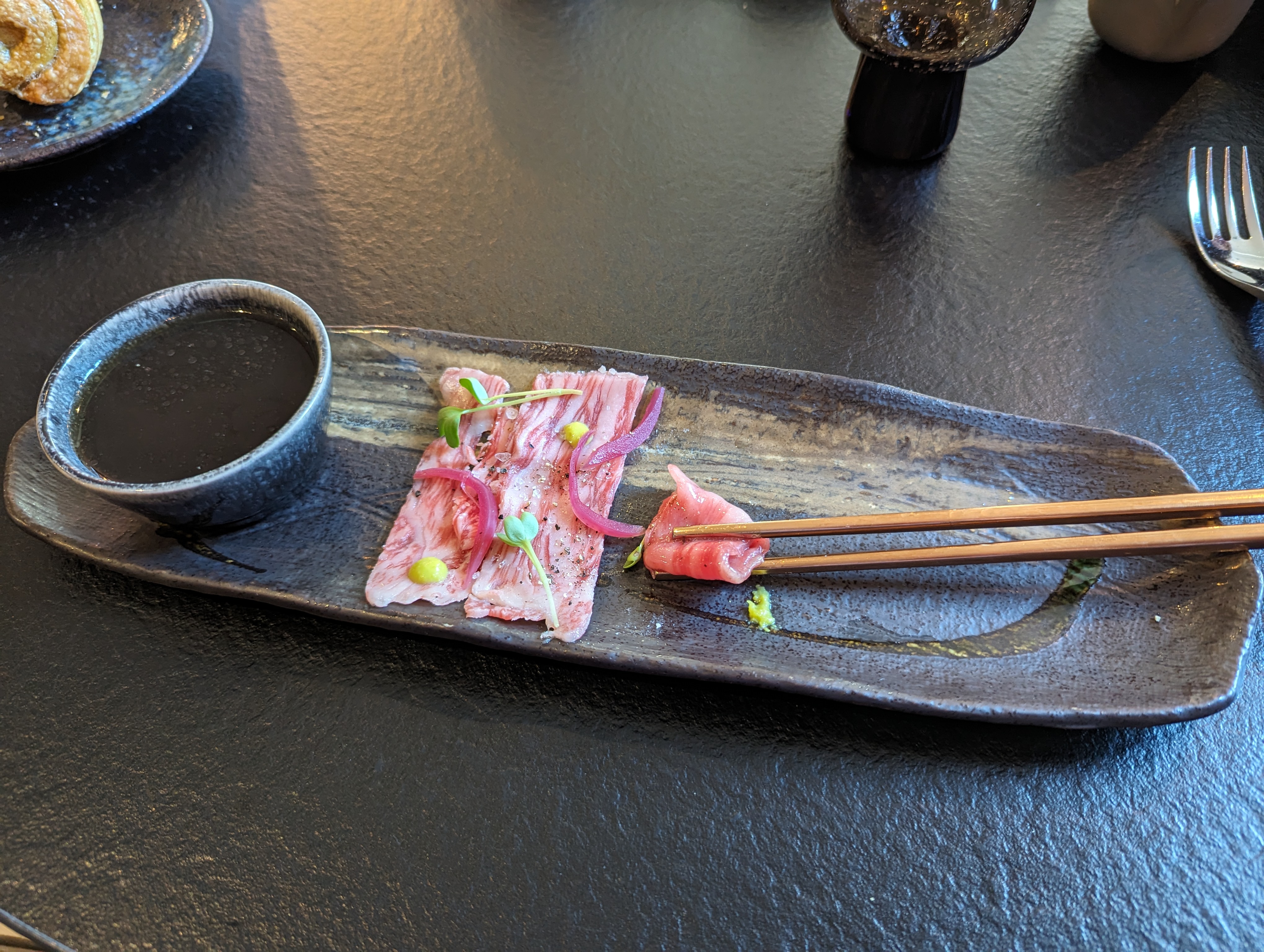 Très bonne table, service excellent. Très belle découverte de la viande de Kobe. Desserts très beaux et bons. Nous y retournerons avec plaisir. Bonne continuation à toute l équipe et merci pour ce bon moment.
