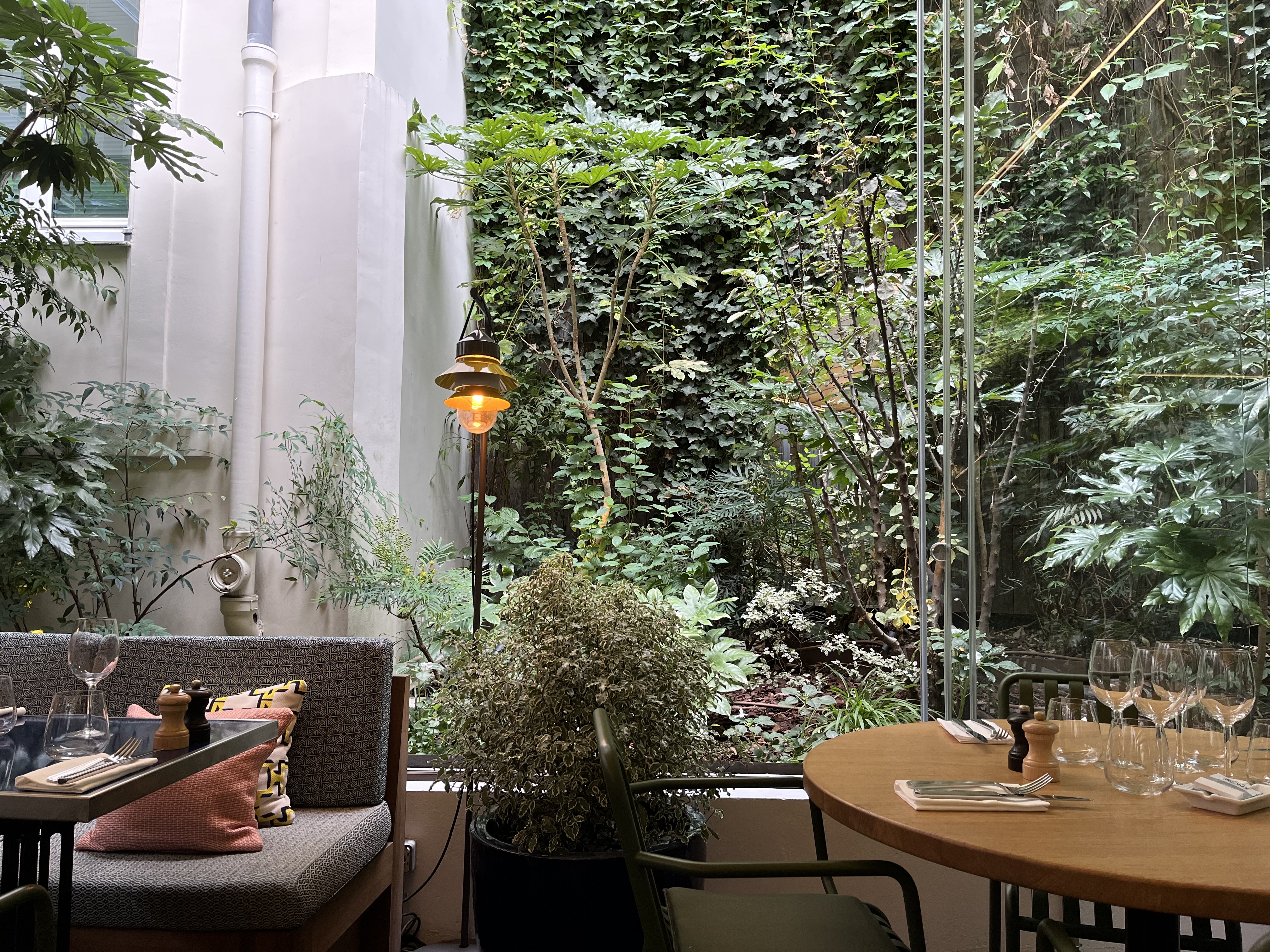 Cuisine simple sur le papier, mais extrêmement raffinée dans l'assiette. Tables parfois un peu festives ;). Et le jardin intérieur promet d'être un délice les jours d'été...
