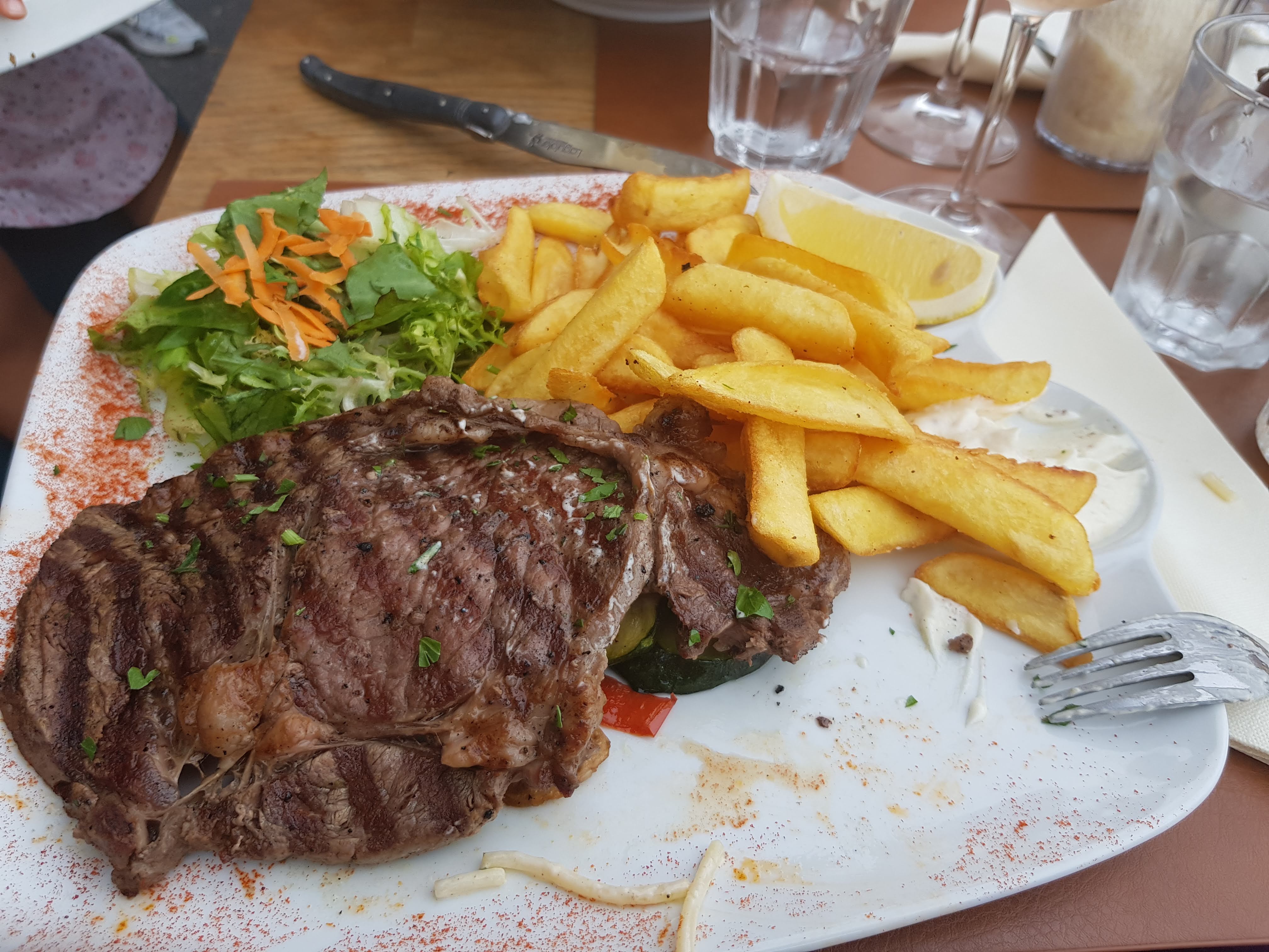Un accueil agréable en plein coup de feu. La quantité est là. Et la formule pas très chère: 18€90 entrée plat ou plat dessert. En revanche la qualité des plats, en particulier de l’entrecôte n’était pas vraiment au rdv. Viande pas tendre du tout avec des nerfs de partout. Le serveur a offert le dessert à la personne qui avait pris l’entrecôte. En résumé : sympa pour voir un verre au soleil