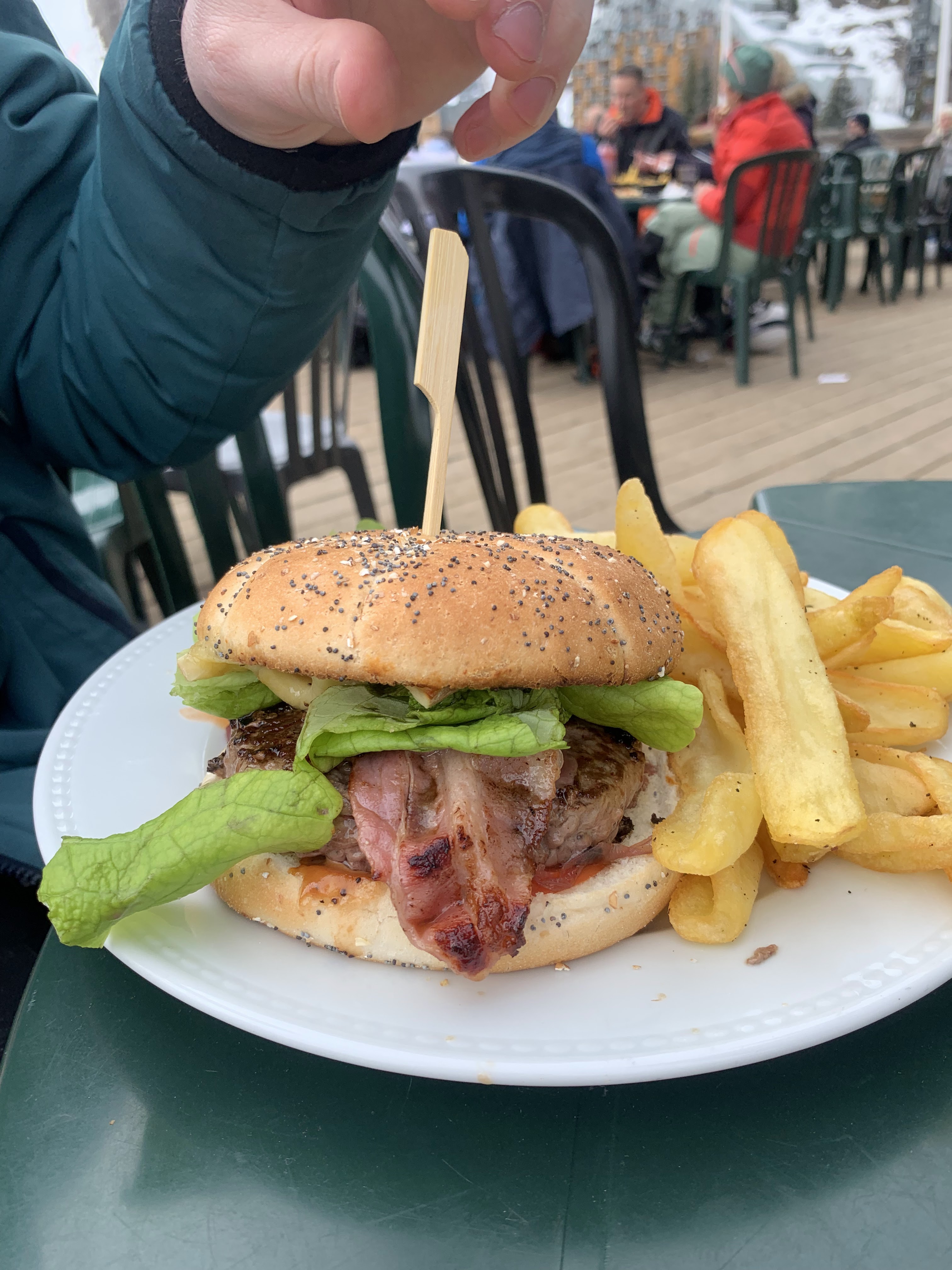Super bar et restaurant d'après-midi servant des hamburgers à la viande 🍔 et des frites chaudes 🍟 ou des hot-dogs et des baguettes 🥖 le personnel est sympathique et la vue sur le ski est incroyable 😻