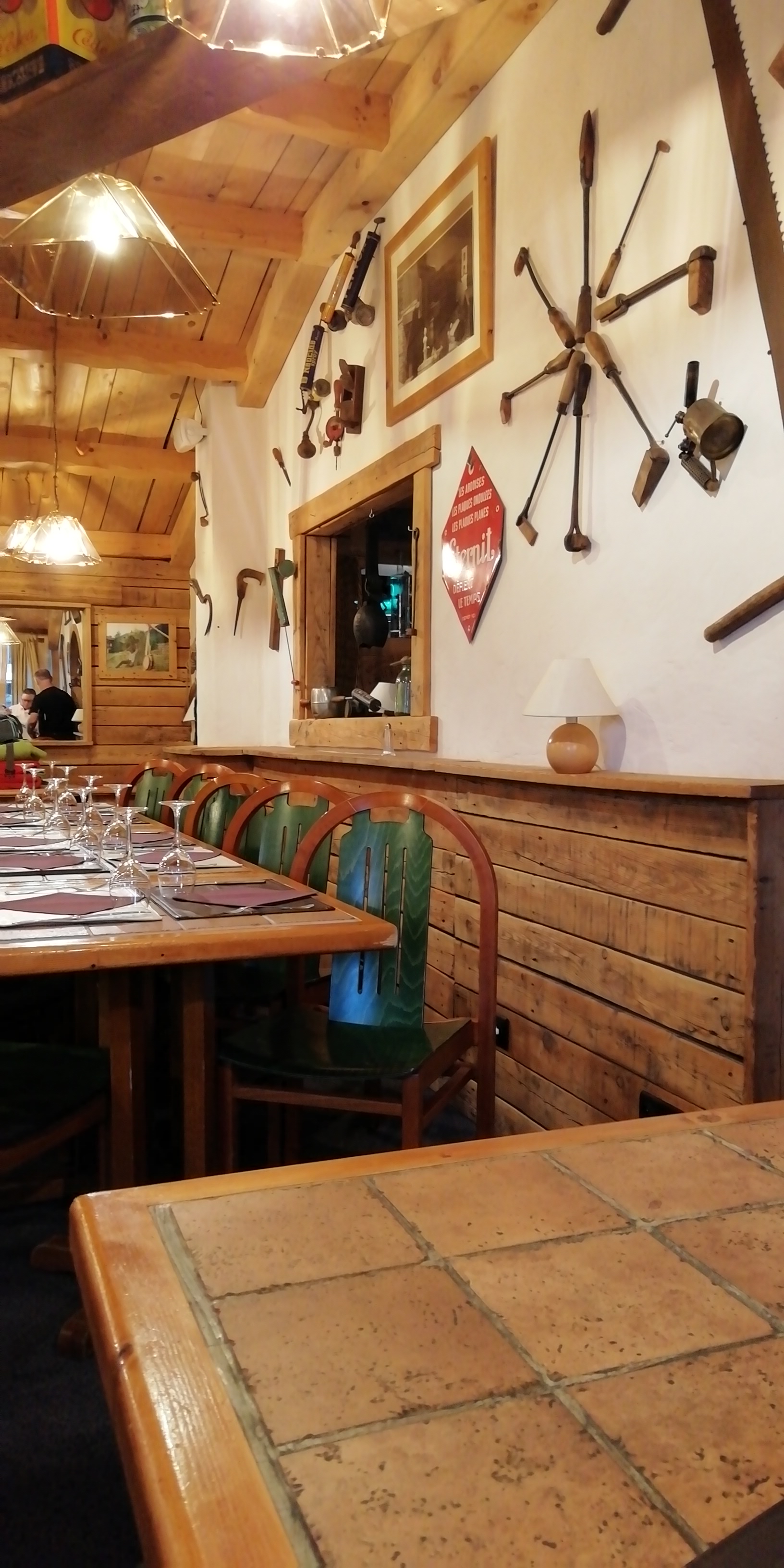 La décoration des 3 salles est typique des Alpes et chaleureuse. La cuisine est très bonne et en bonne quantité. Le service est très bien et de bon conseil. La fondue savoyarde est très bonne et son accompagnement généreux. Le hamburger est tout autant délicieux et généreux. (En arrivant nous avions froid, mais le serveur a fermé les portes dès la première demande).